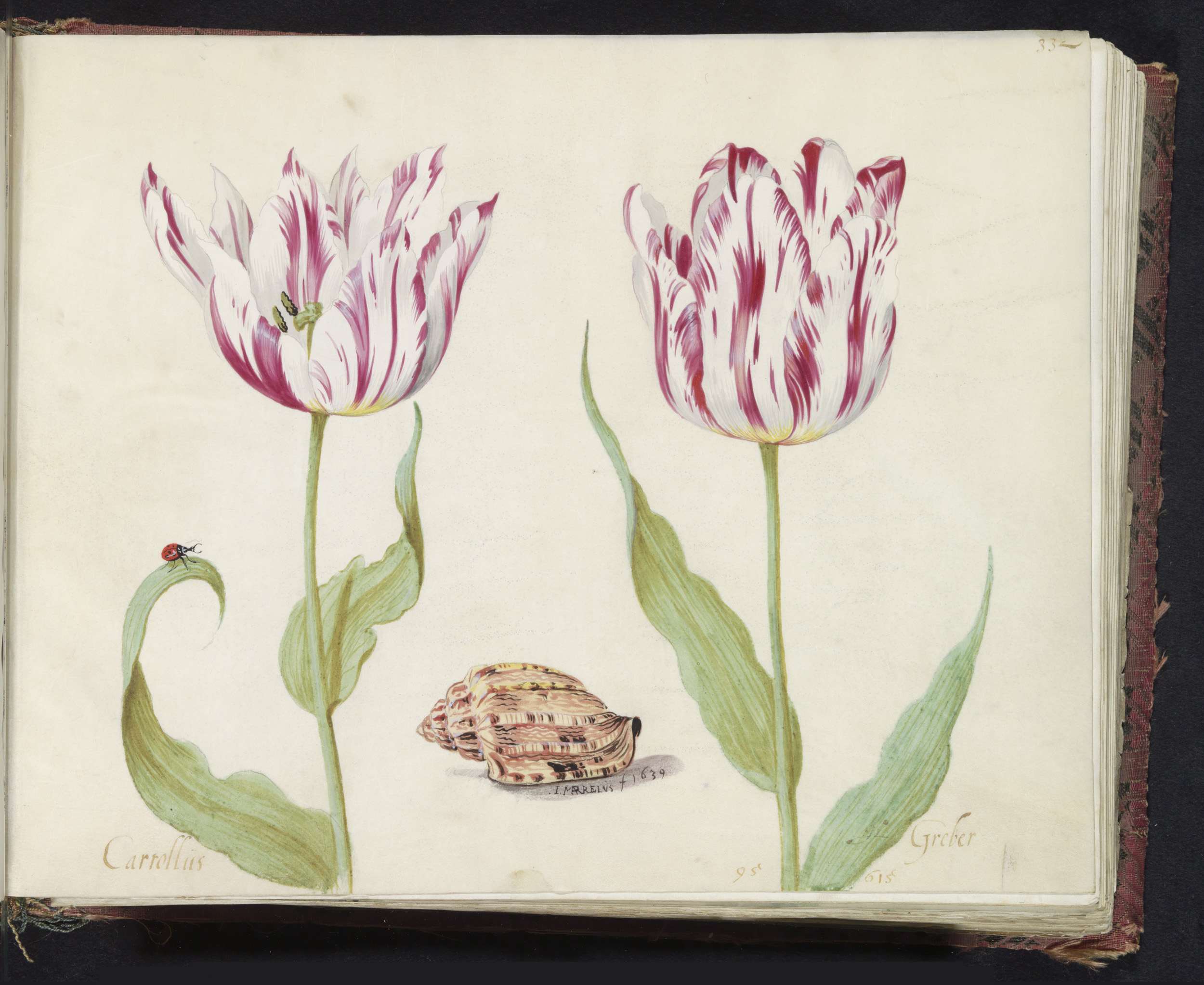 Twee tulpen met schelp en vliegende kever