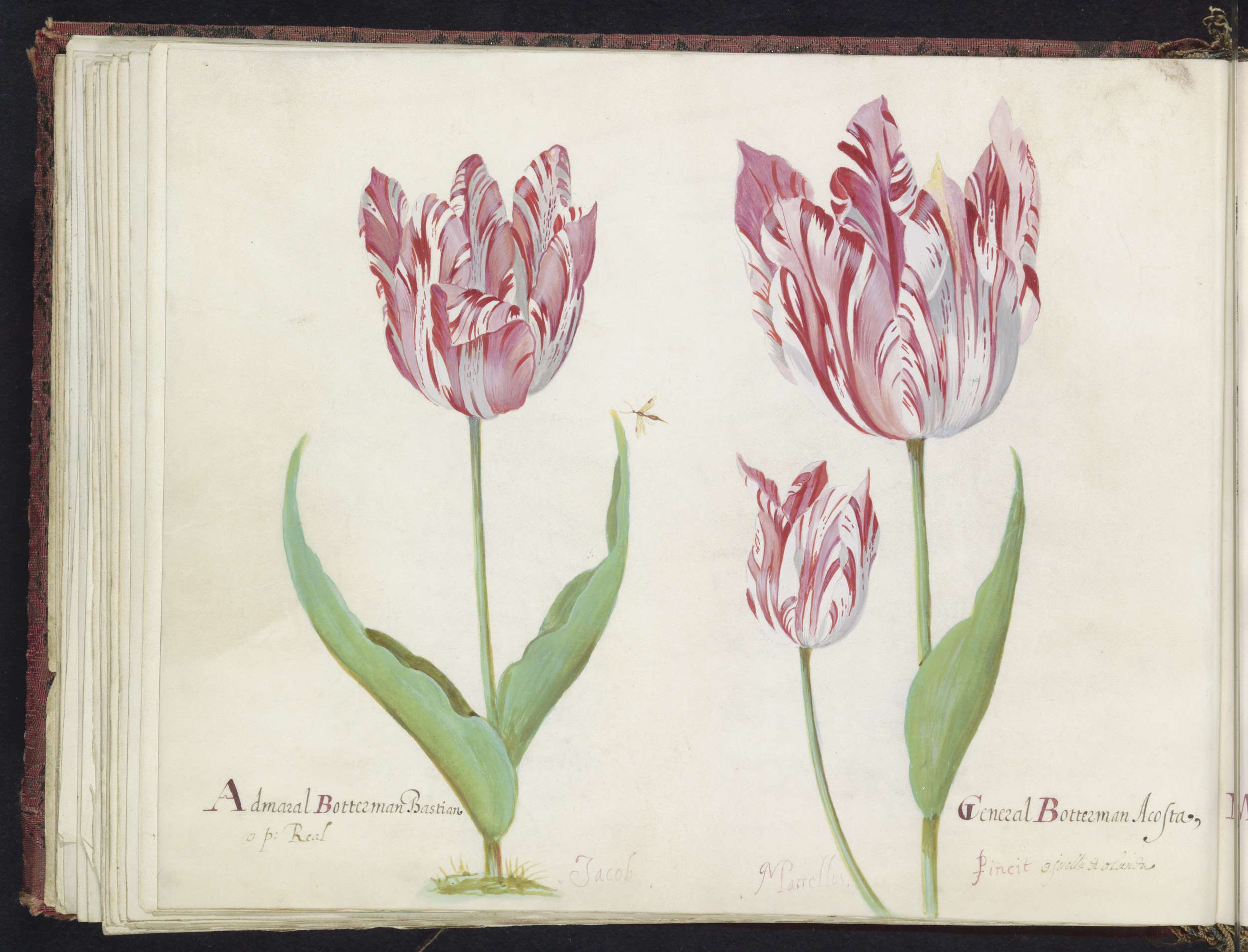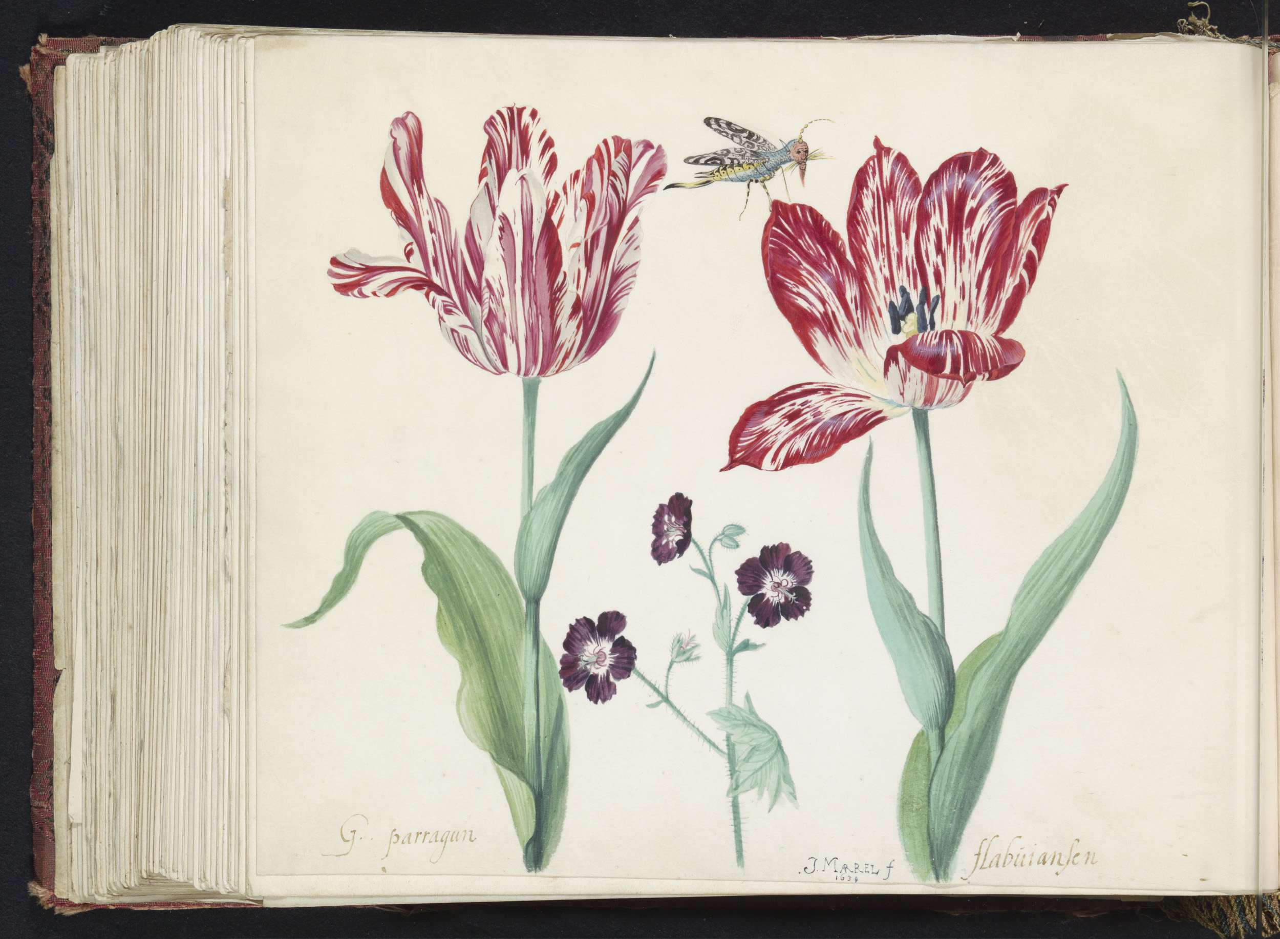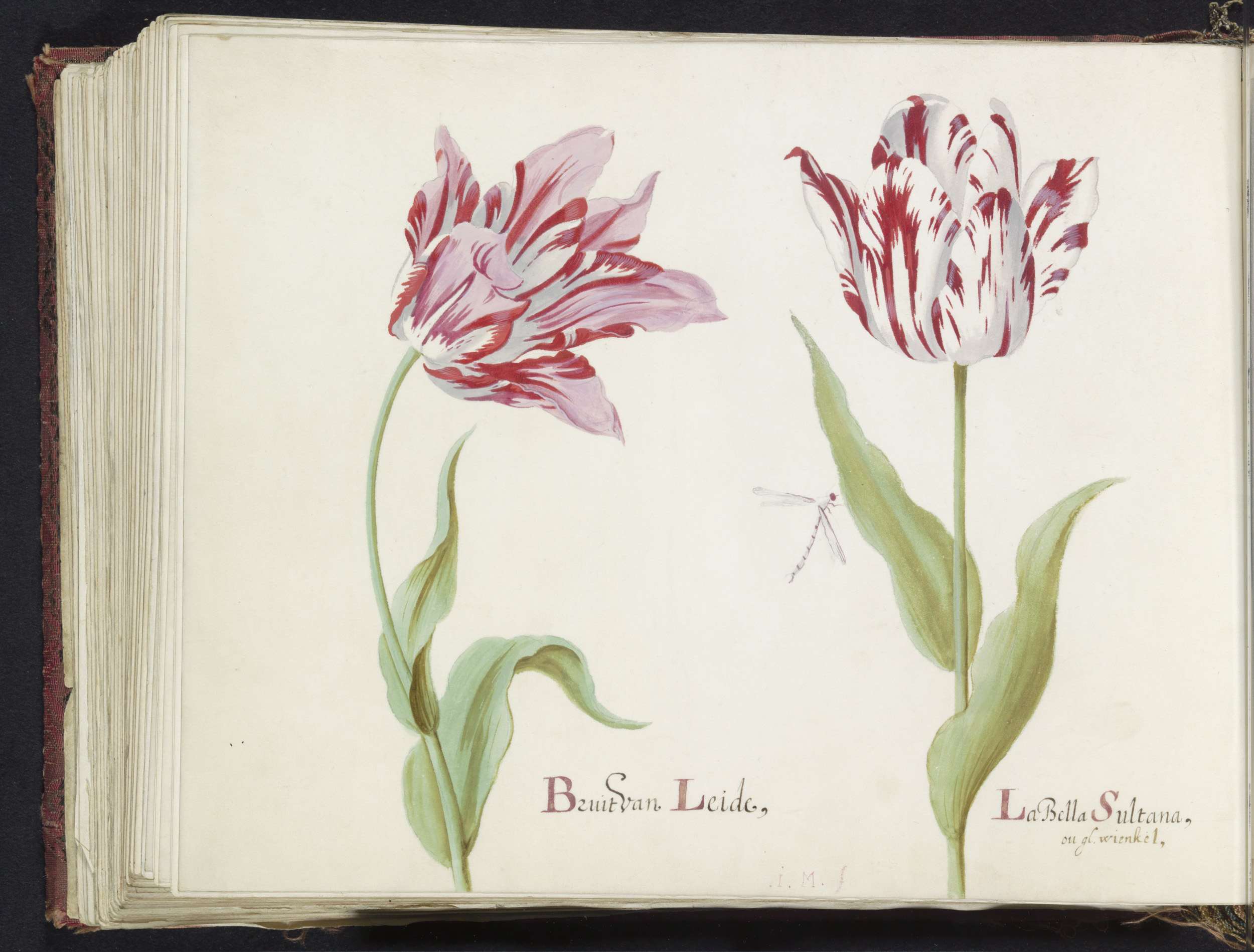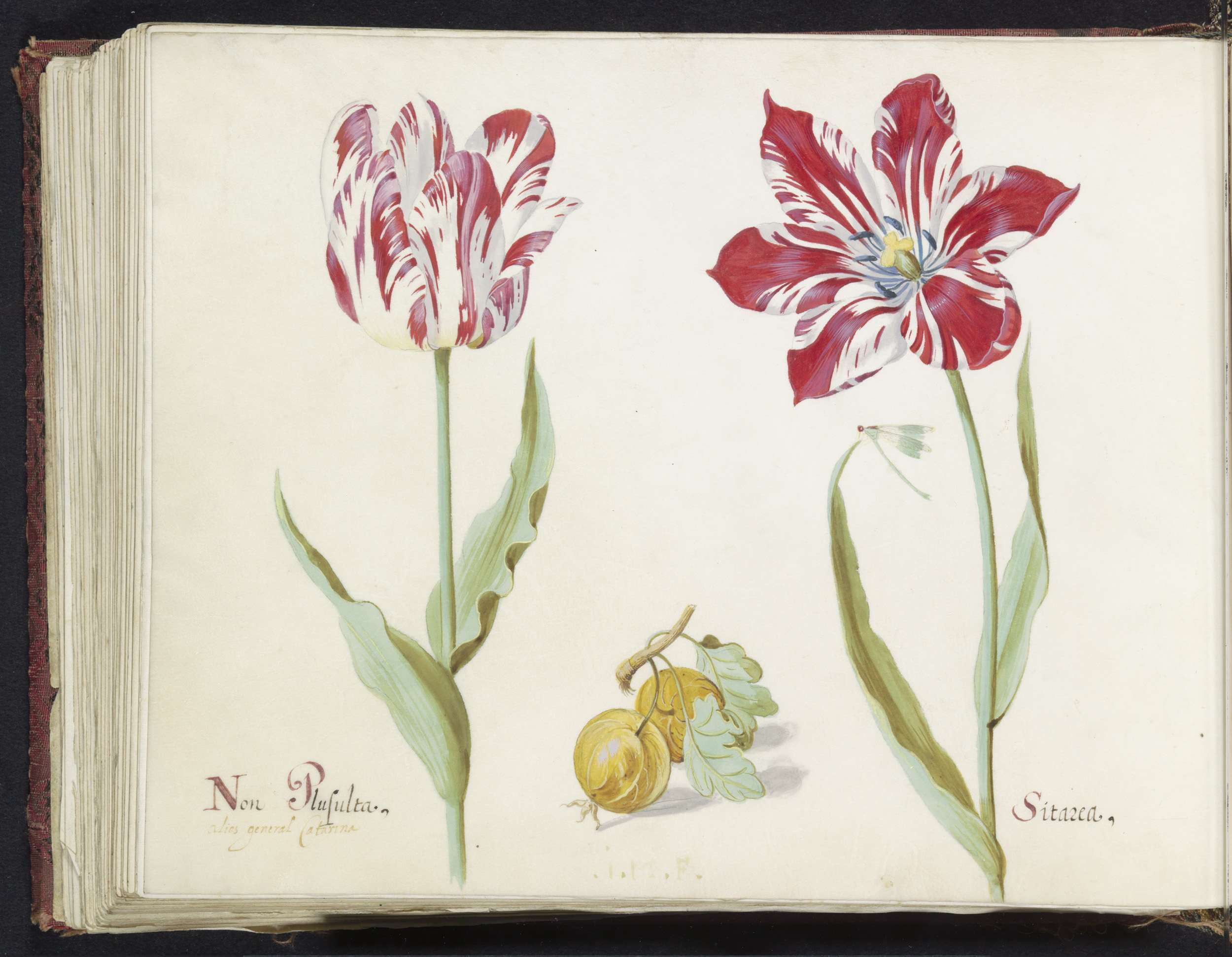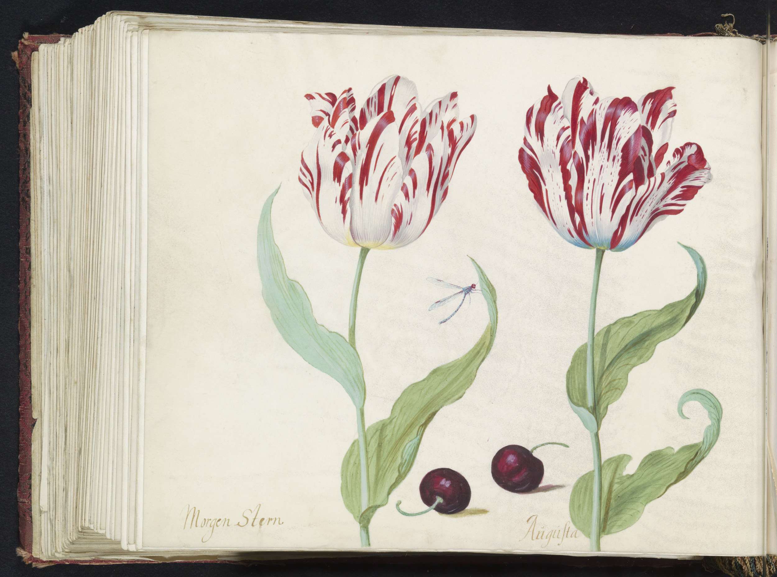 Twee tulpen met twee morellen en waterjuffer