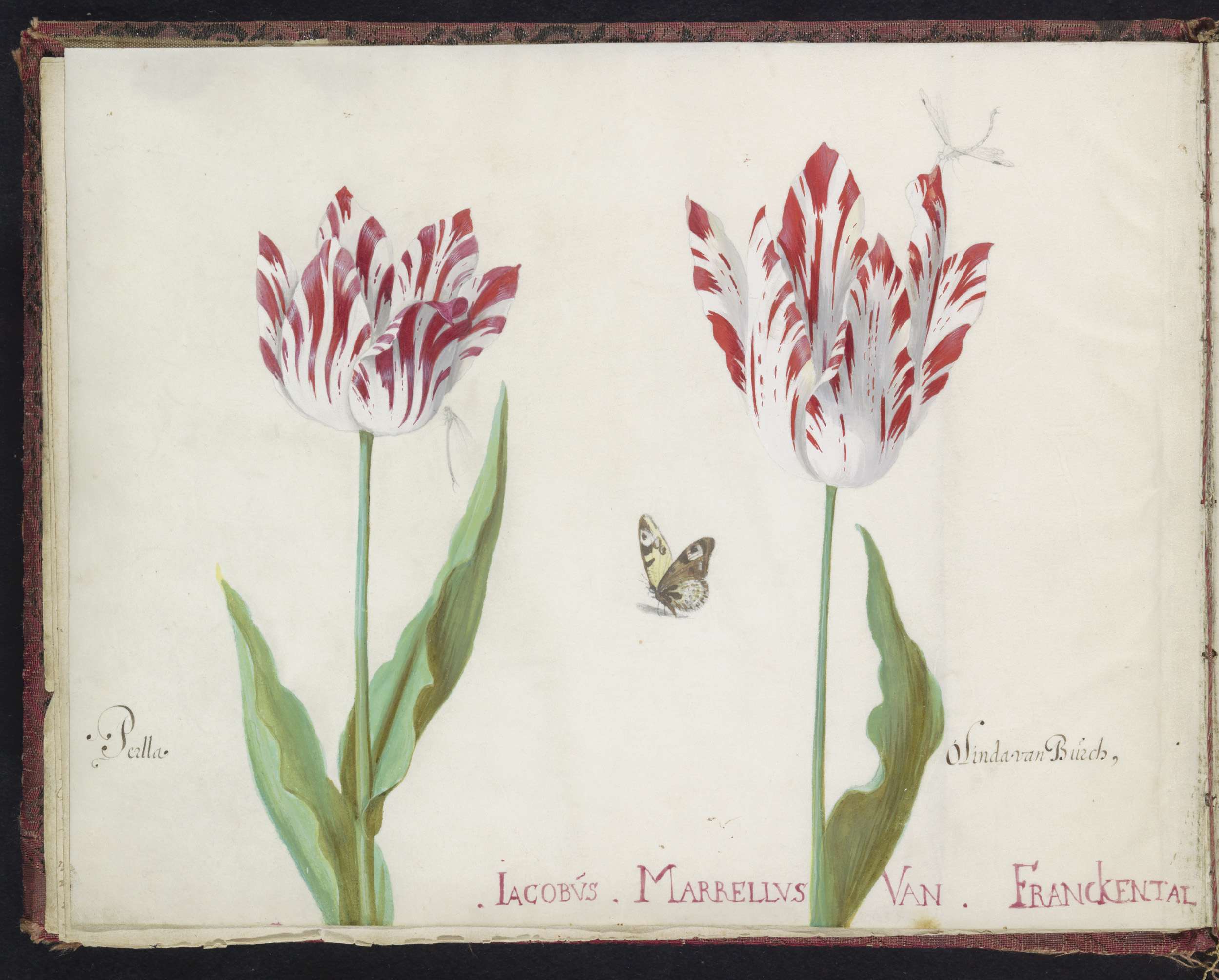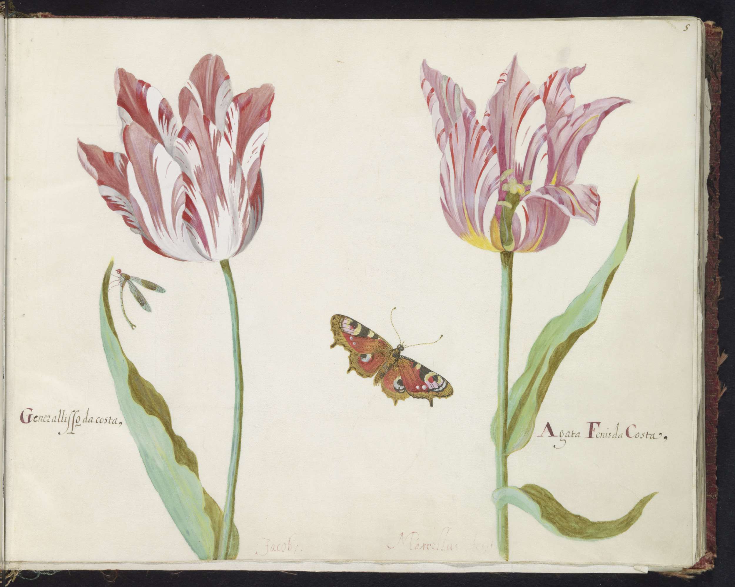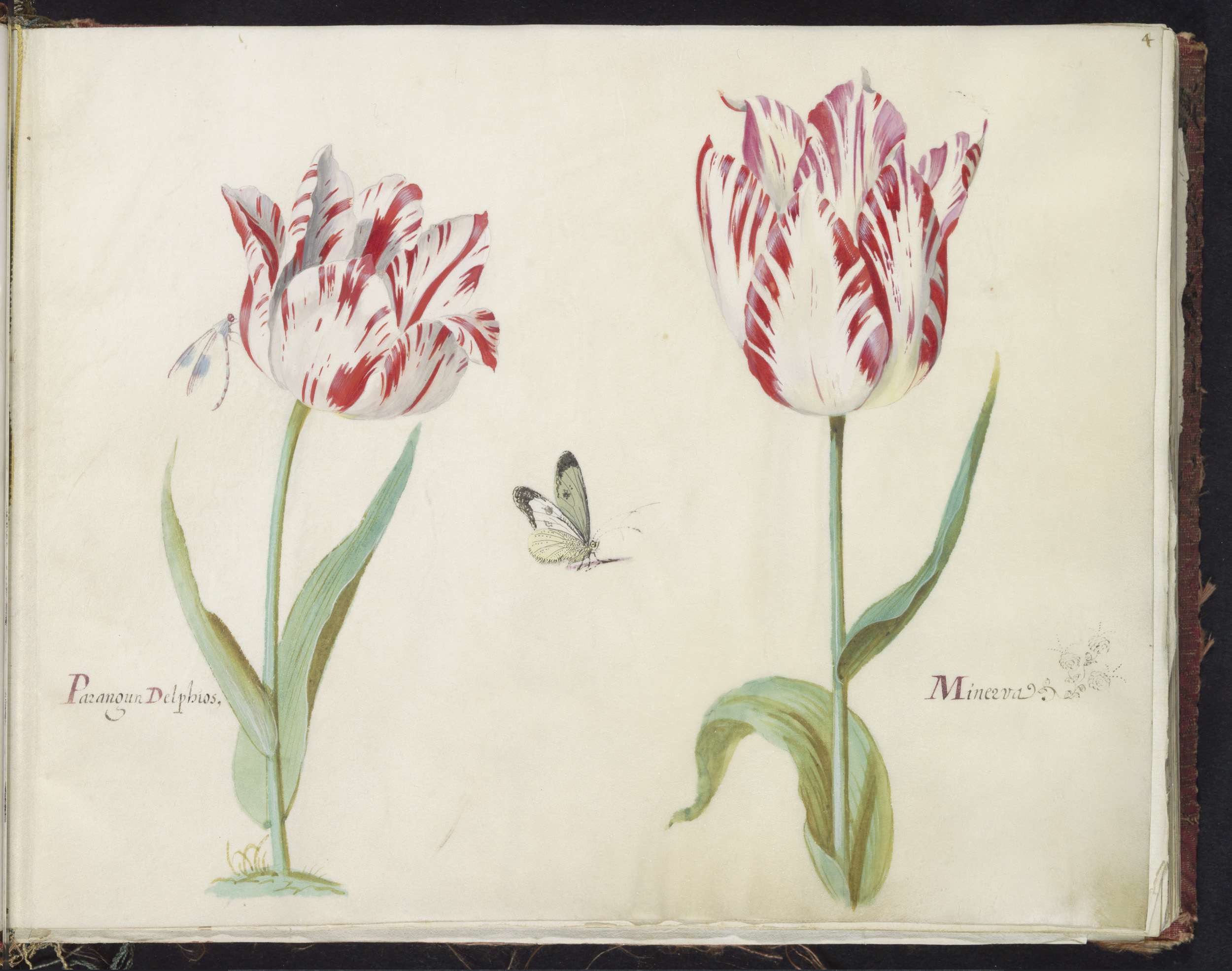 Twee tulpen met waterjuffer en dagpauwoog