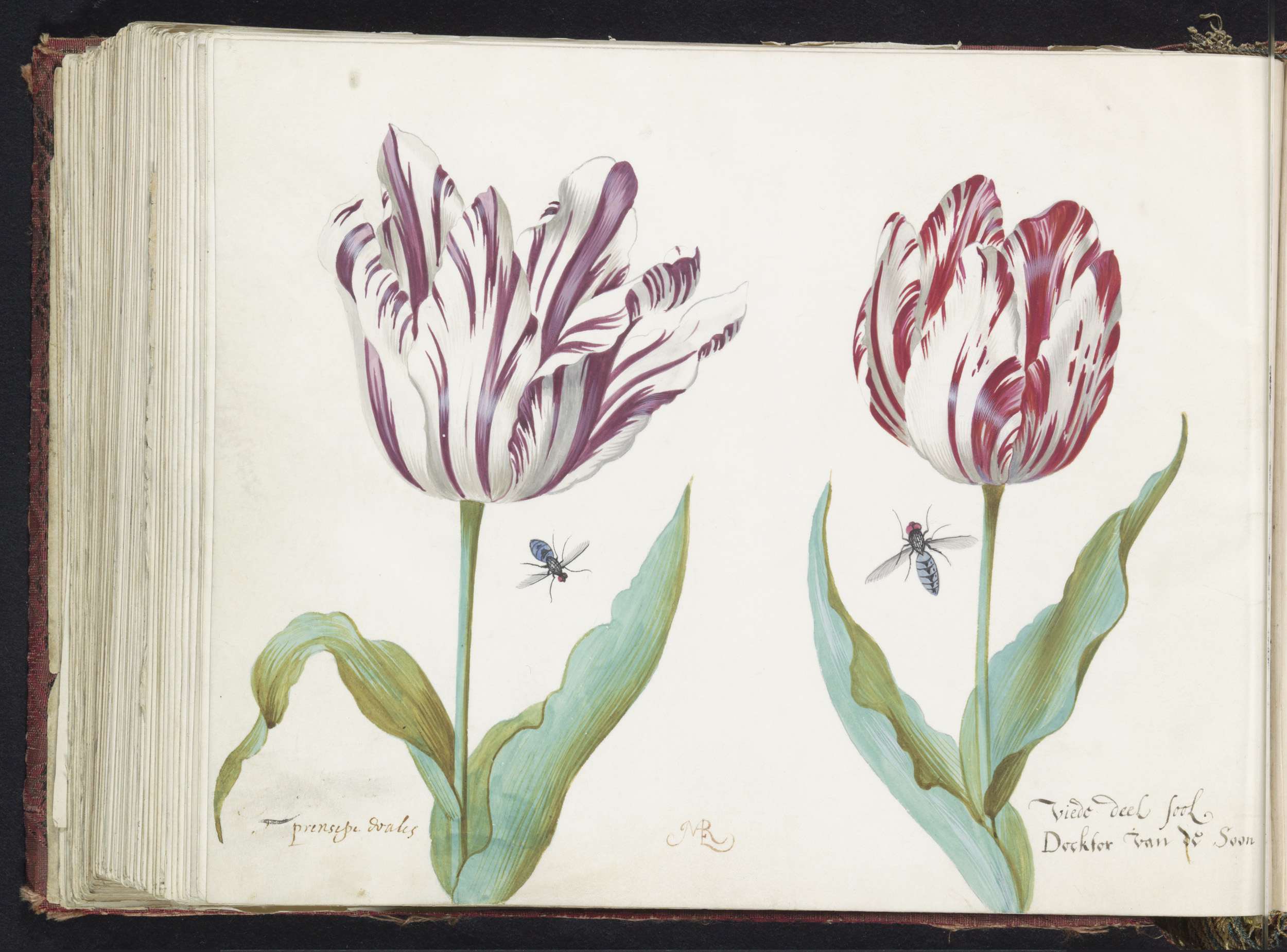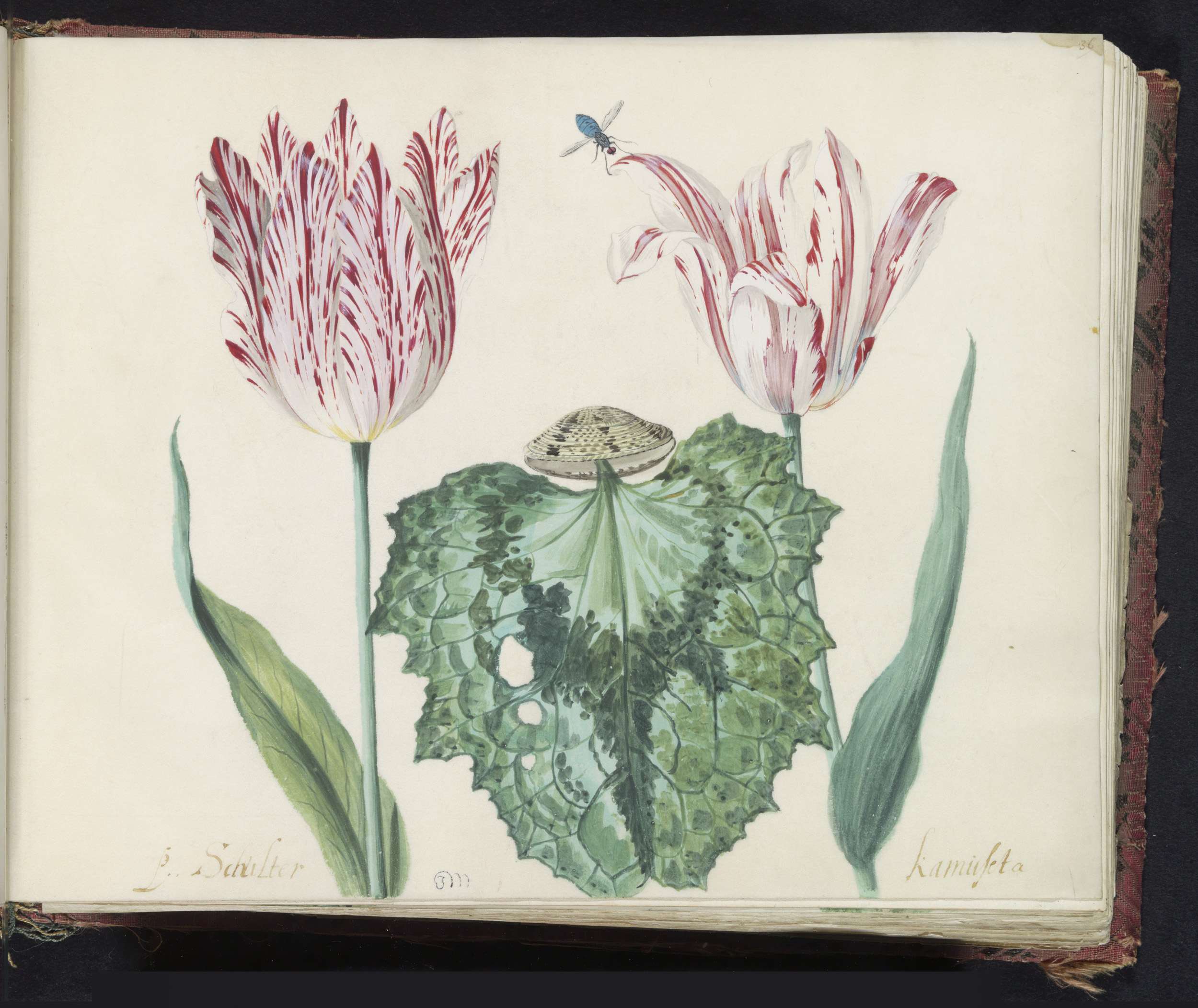 Twee tulpen met schelp, vlinder en vlieg