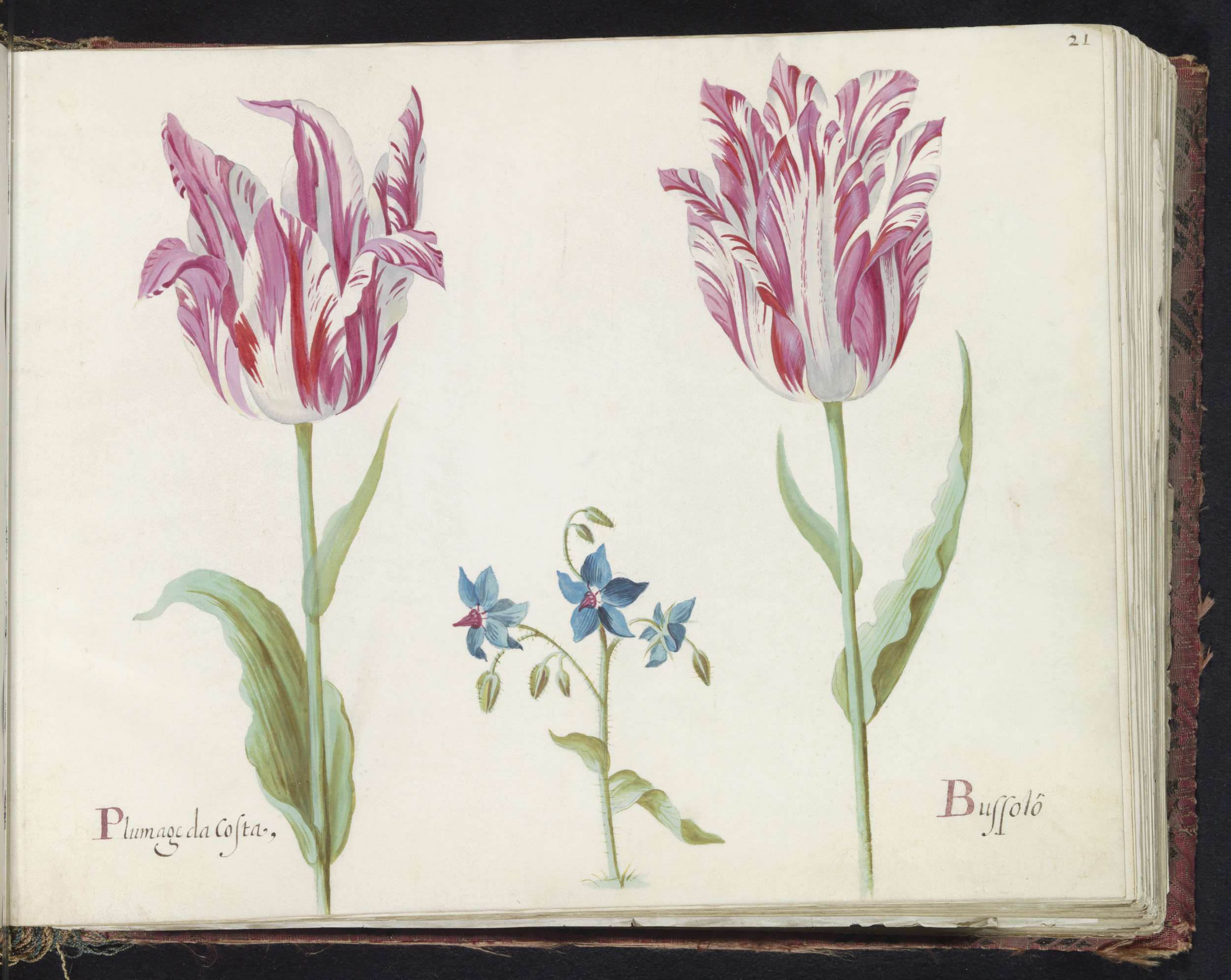 Twee tulpen met schelp en groot blad