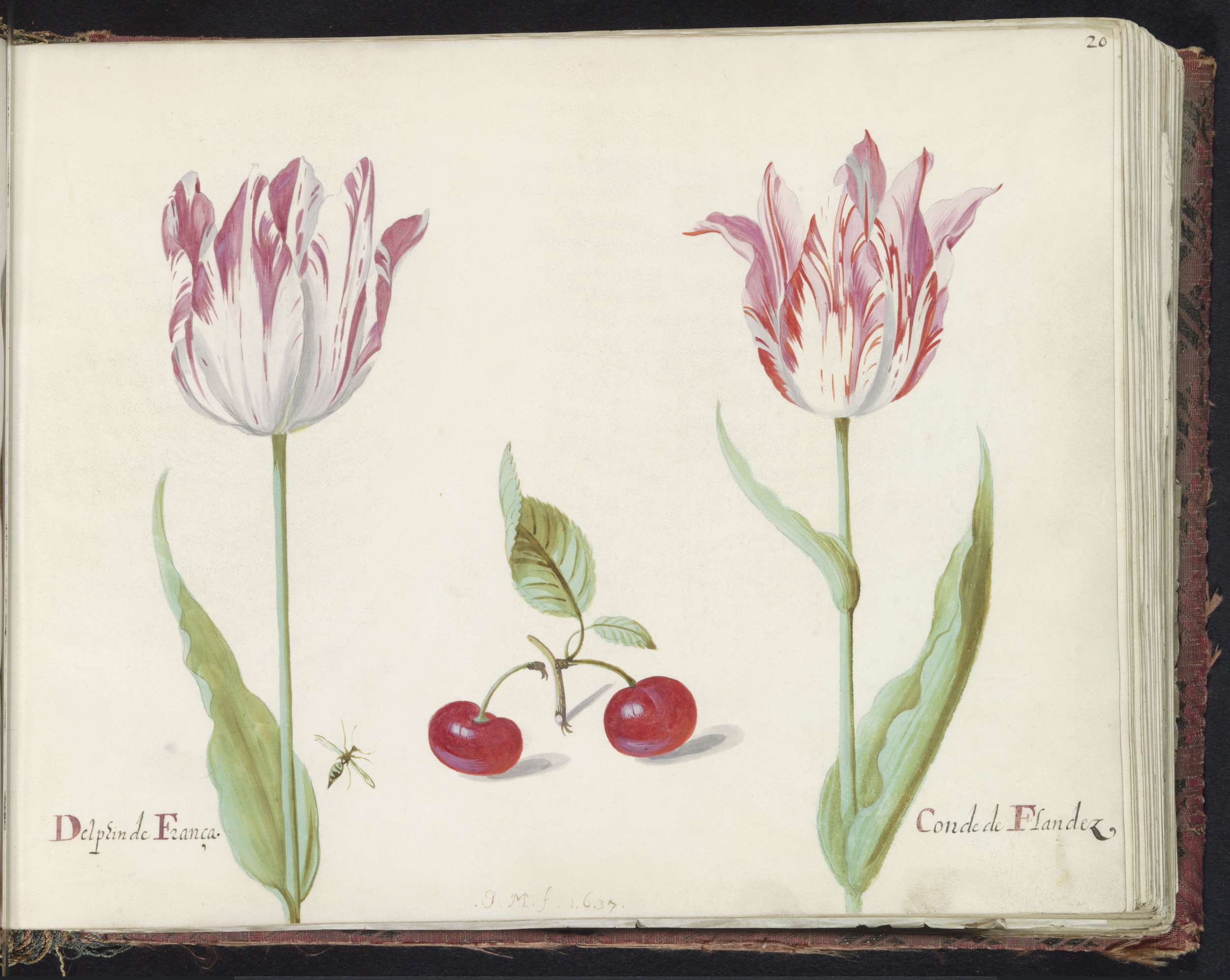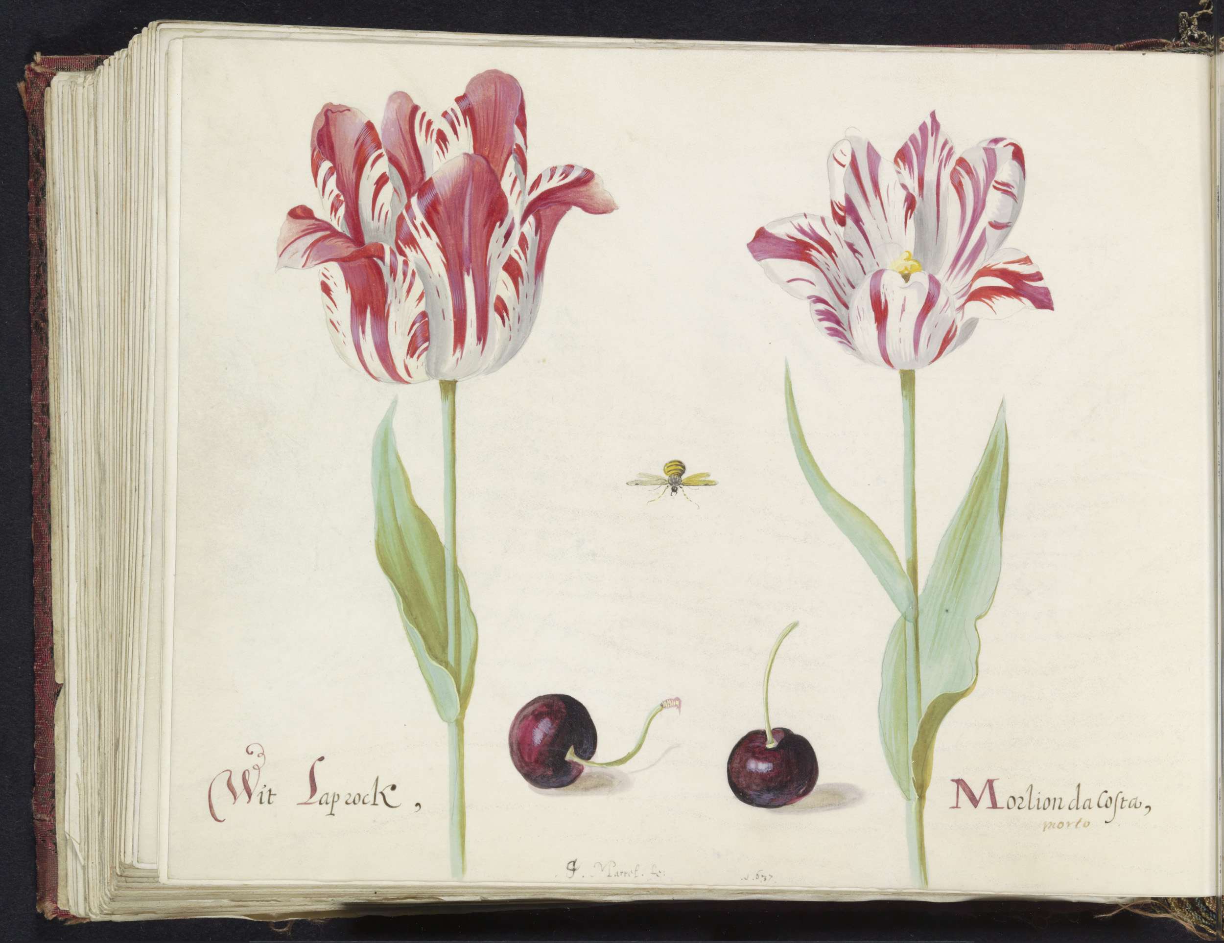 Twee tulpen met twee kersen en vlieg