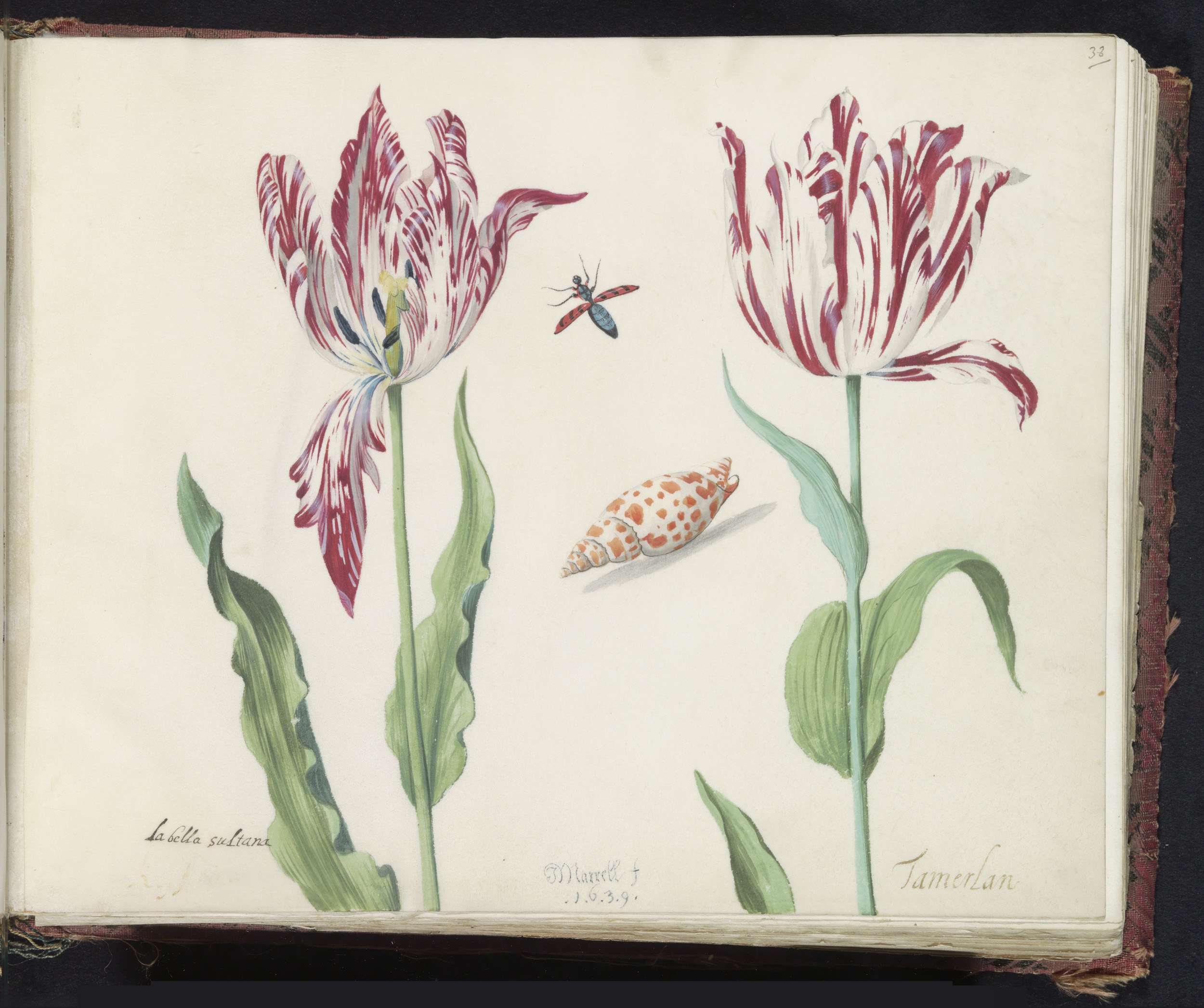 Twee tulpen met schelp, kever, vlieg en vlinder