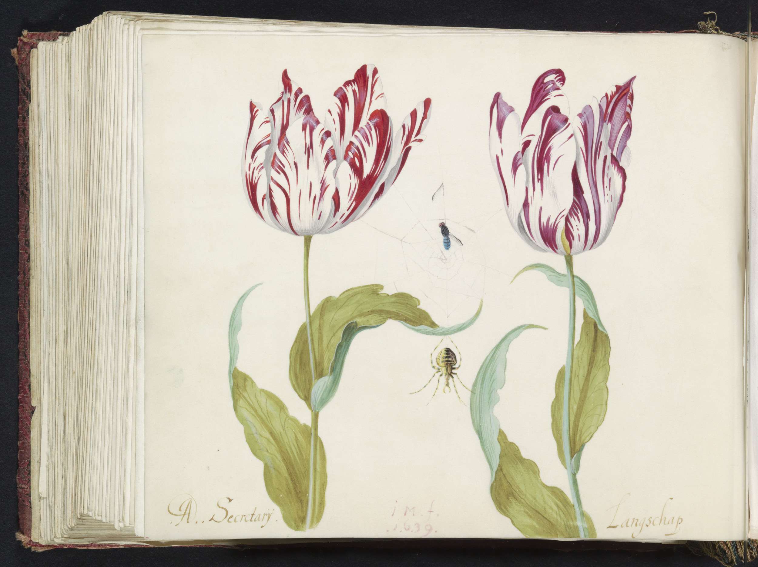 Twee tulpen met spin en vlieg in spinnenweb