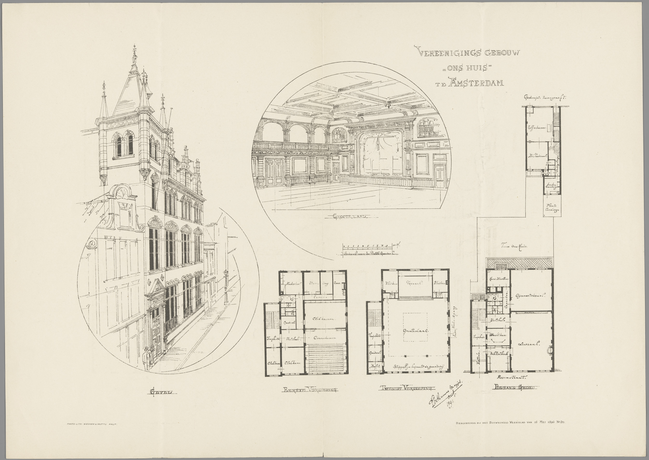 Aanzichten en plattegronden van Verenigingsgebouw On...