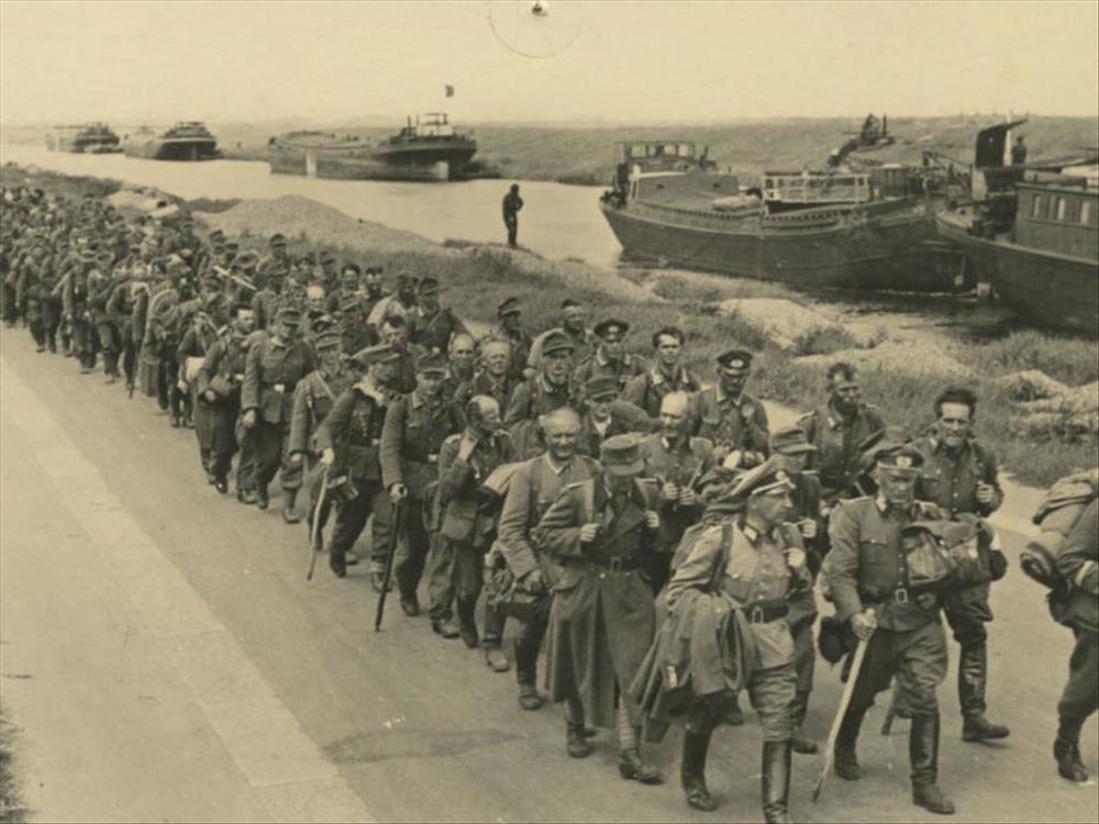 Foto van terugtrekkende Duitse troepen die na de cap...