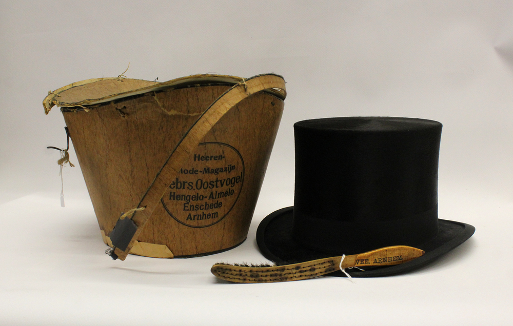 Zwarte hoge hoed van textiel in doos van karton met ...
