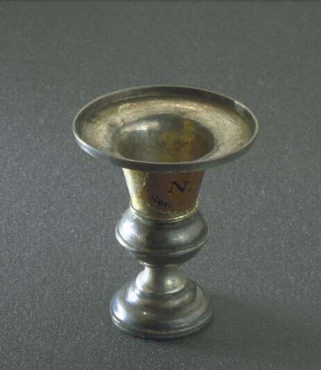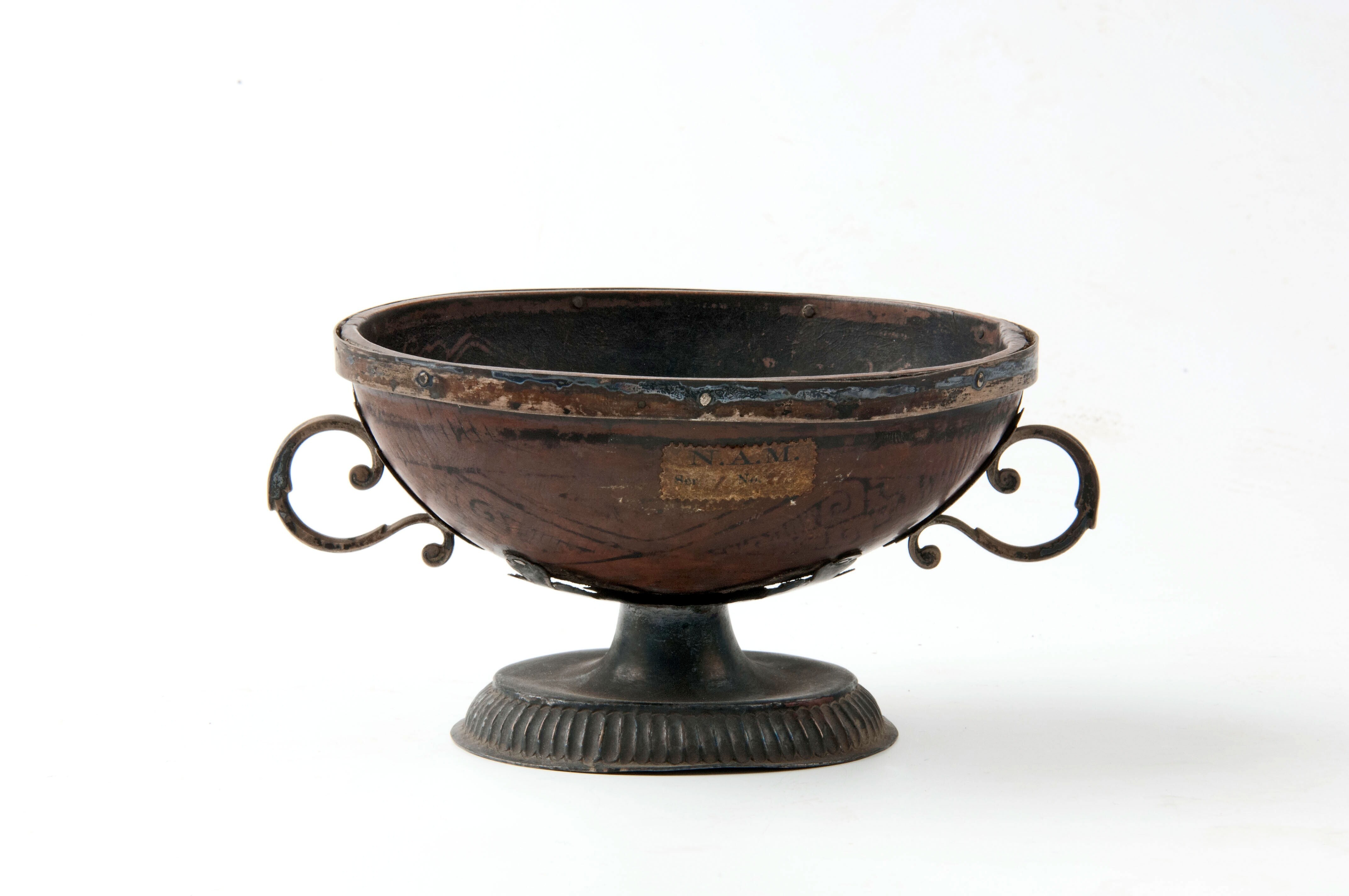 Asbak van kokosnootschaal, staande op een zilveren v...