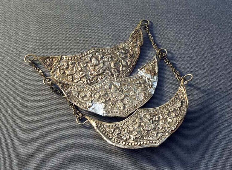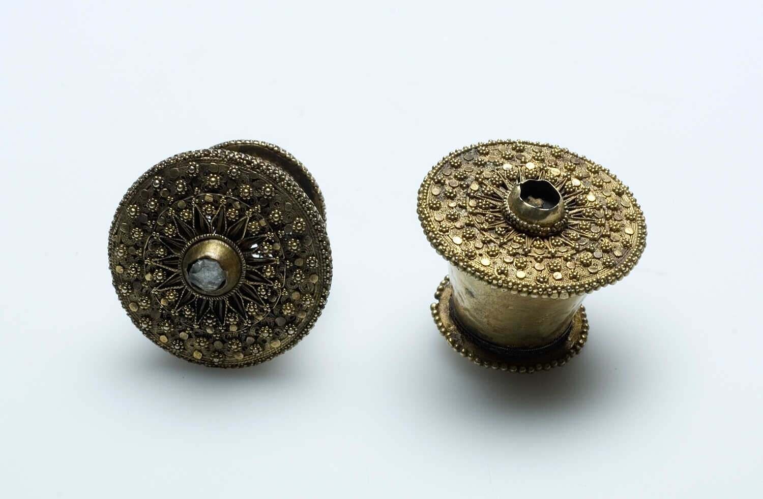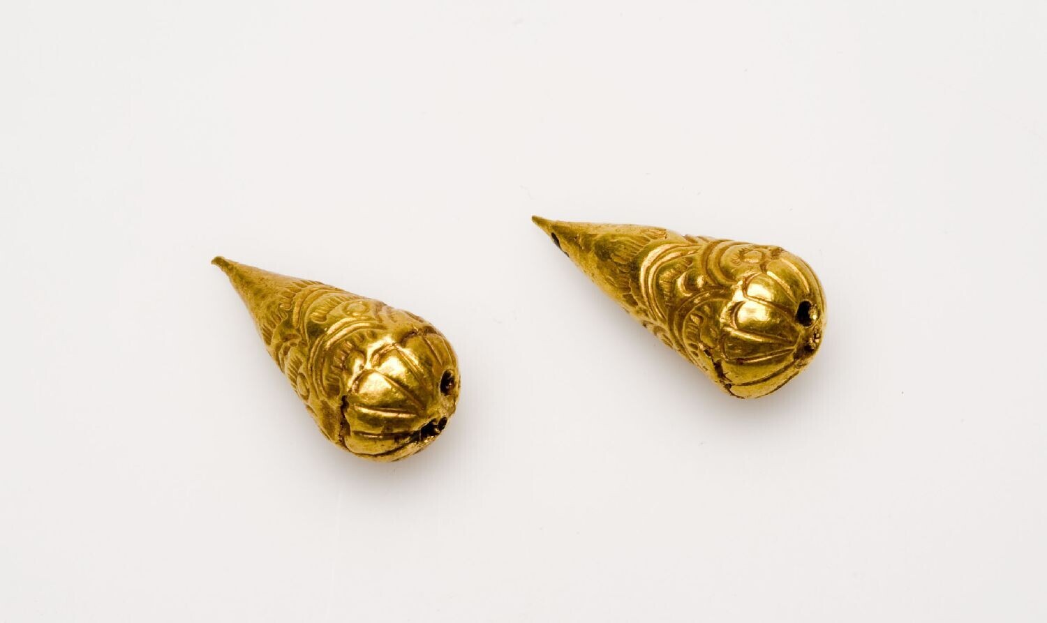 Twee holle, gouden peervormige Indo-Javaanse hangers...
