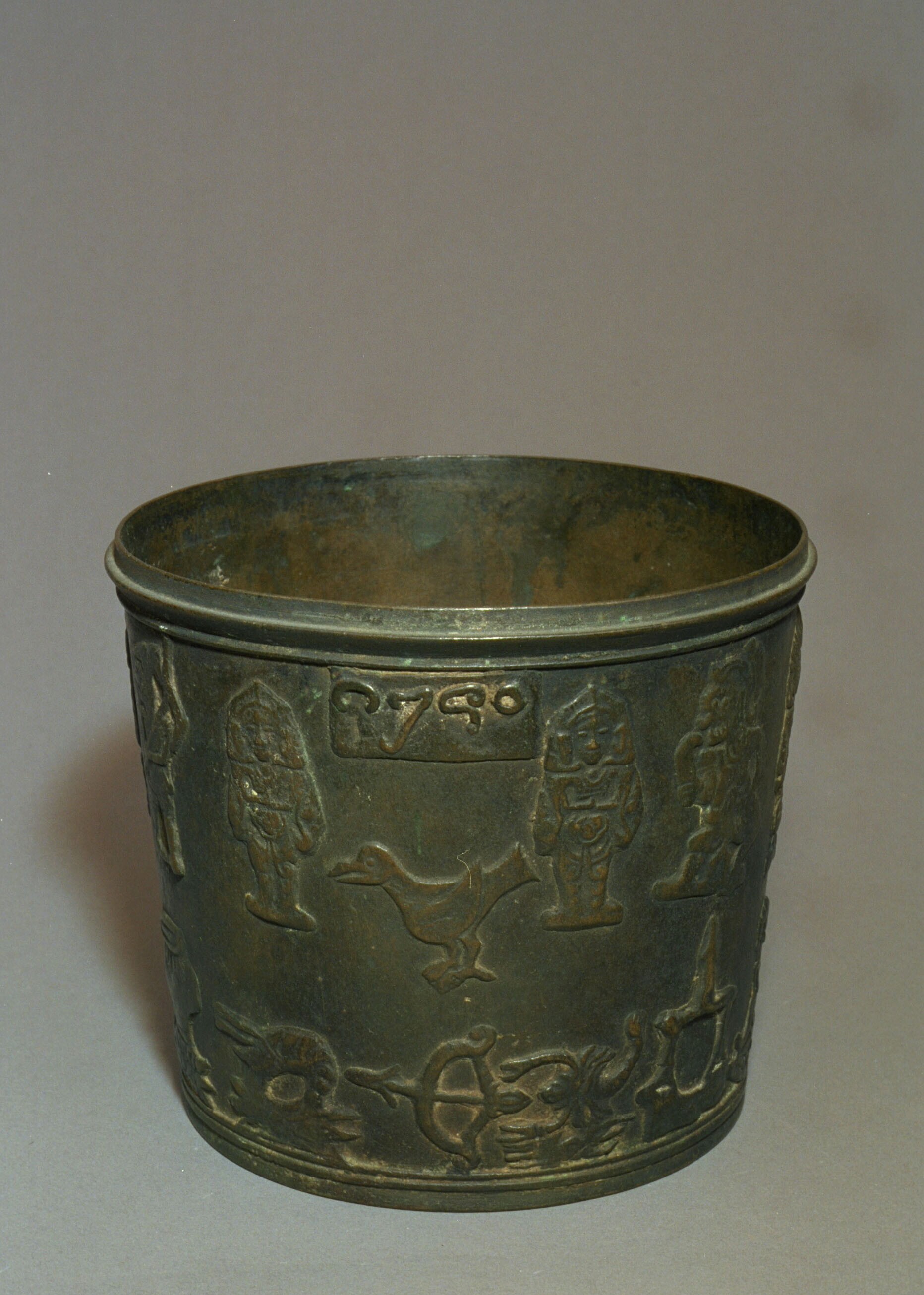 Indo-Javaanse bronzen zodiakbeker, versierd met teke...