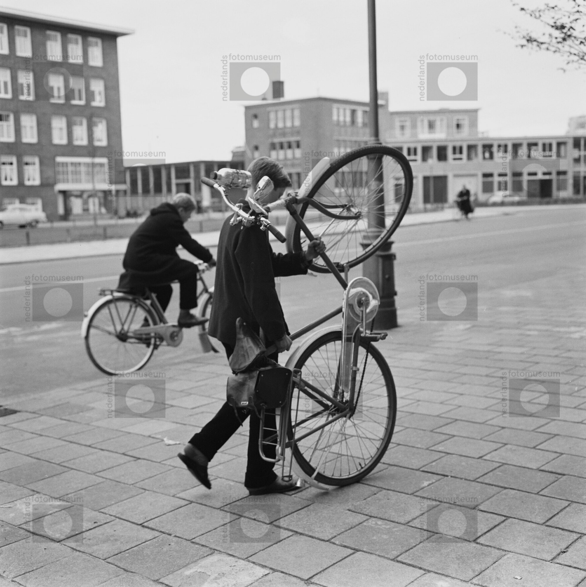 Man loopt met kapotte fiets.