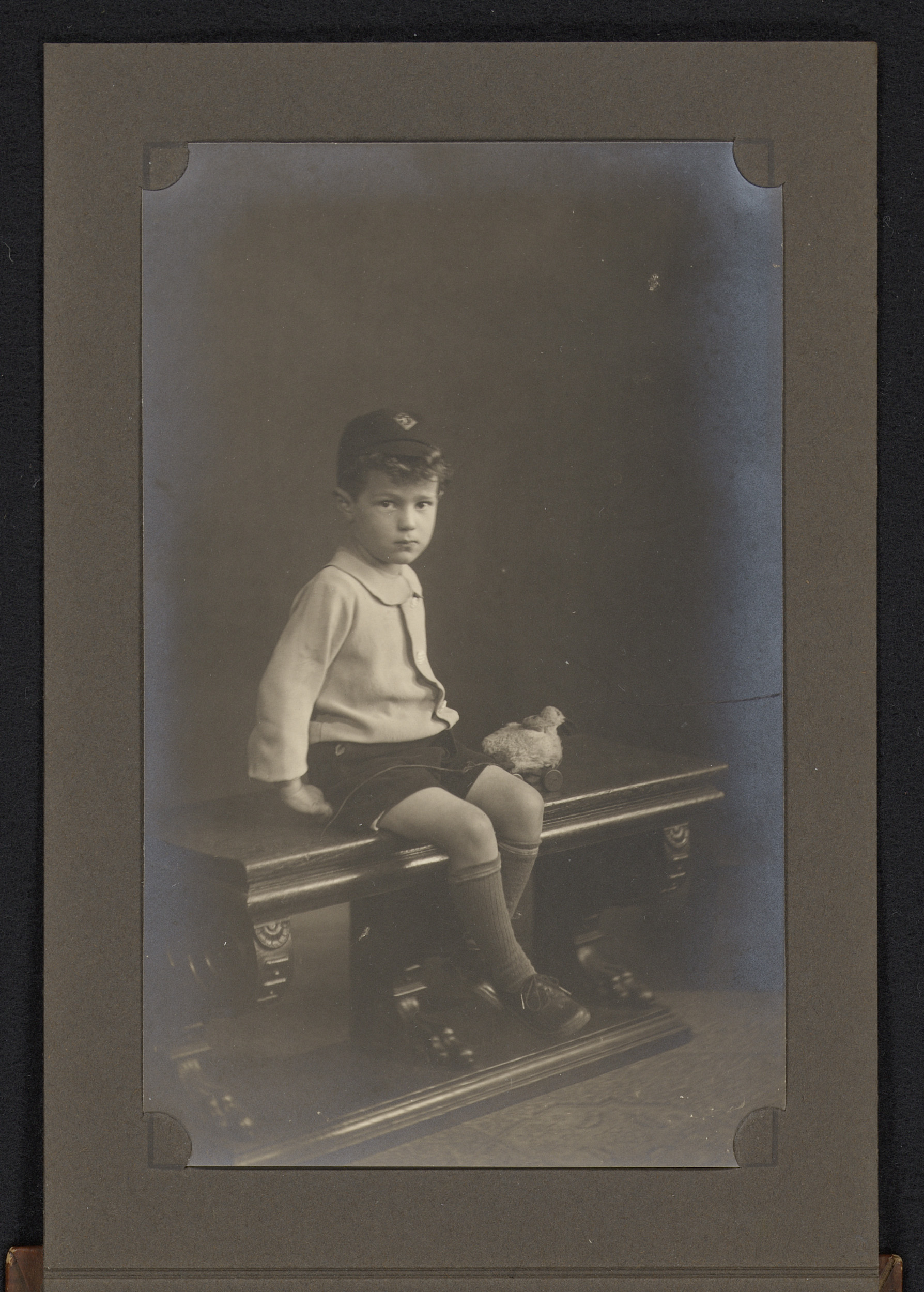 Portret van een jongen, zittend op een bankje
