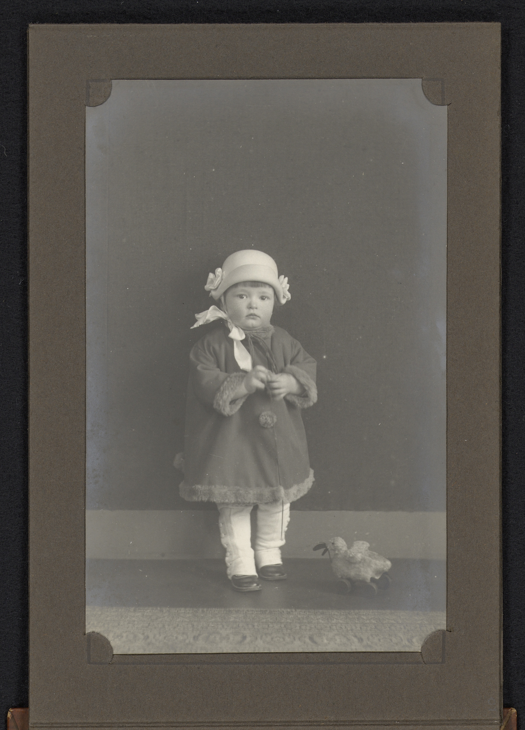 Portret van een peuter, staand bij een speelgoedeend