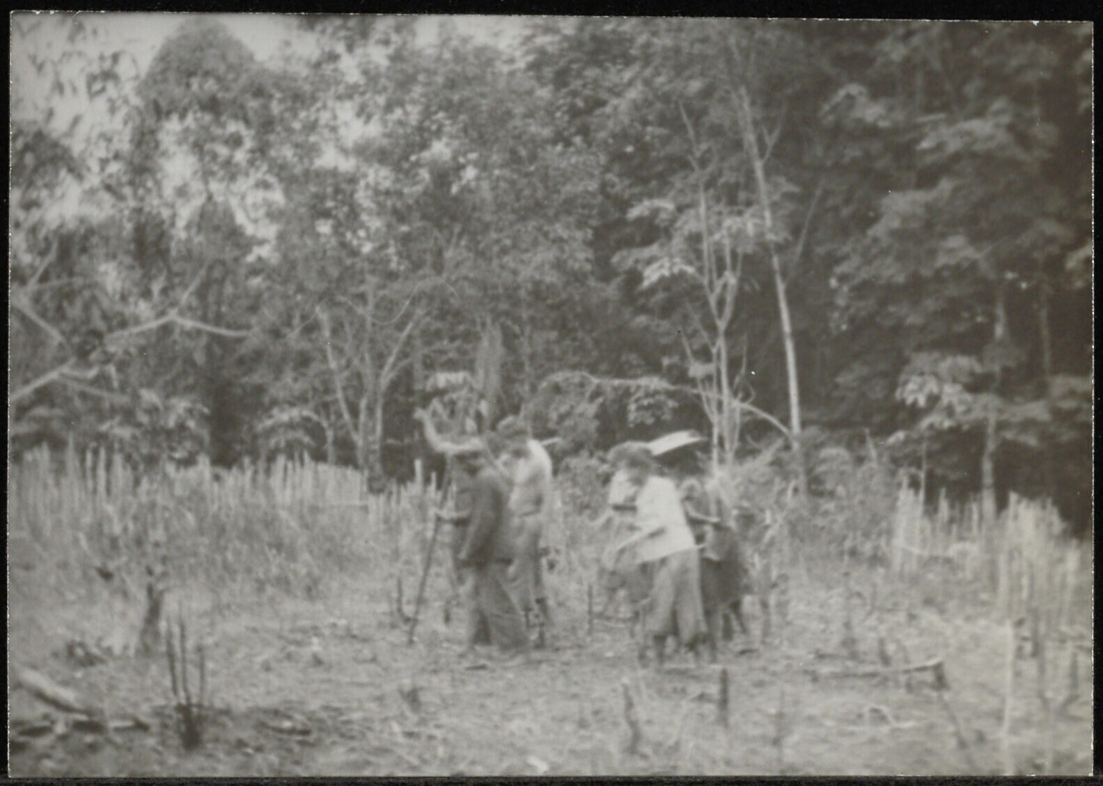 Europeanen en leden van de inheemse bevolking in bos...
