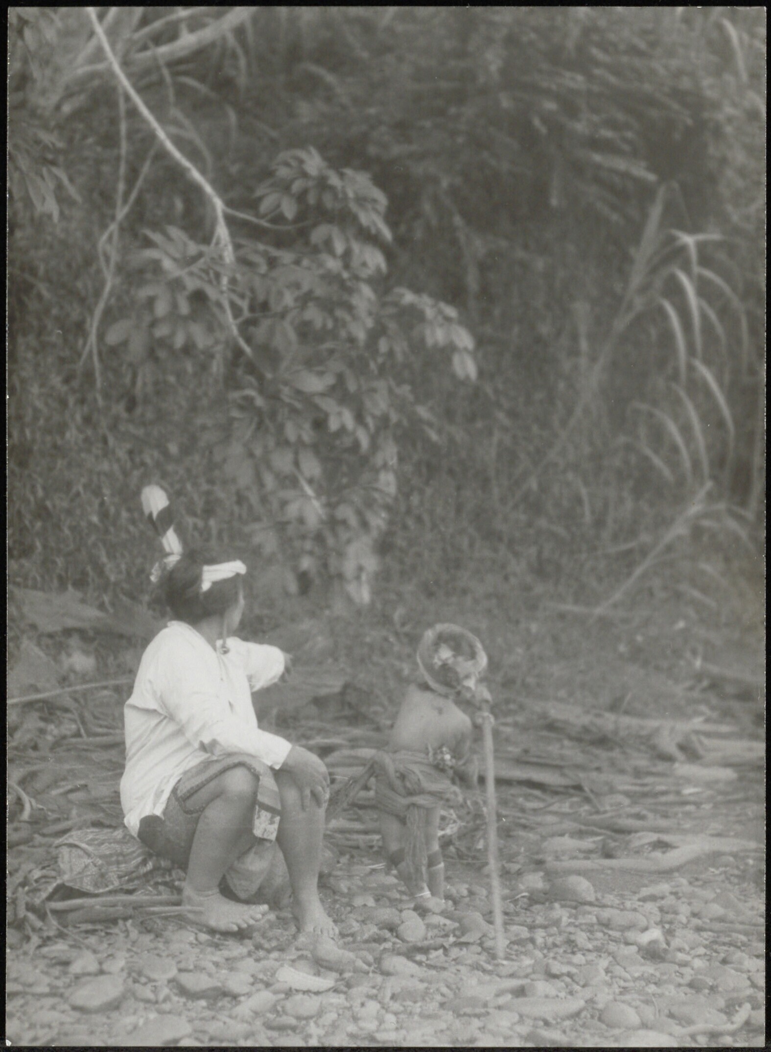 Portret van een Dayak met hoofddoek en opengedragen ...
