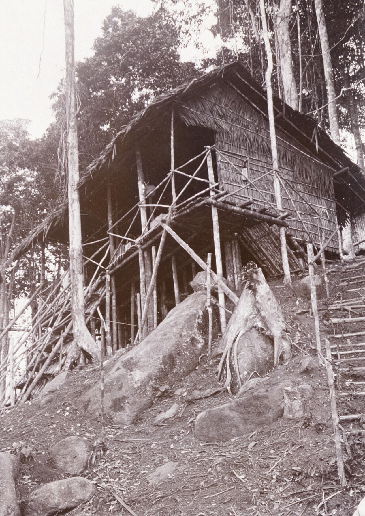 Een Papua onderaan de trap van het 'Heerenhuis' in P...