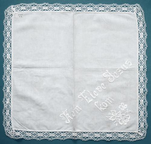katoenen tafelkleed met geborduurde tekst; Kom Lieve...