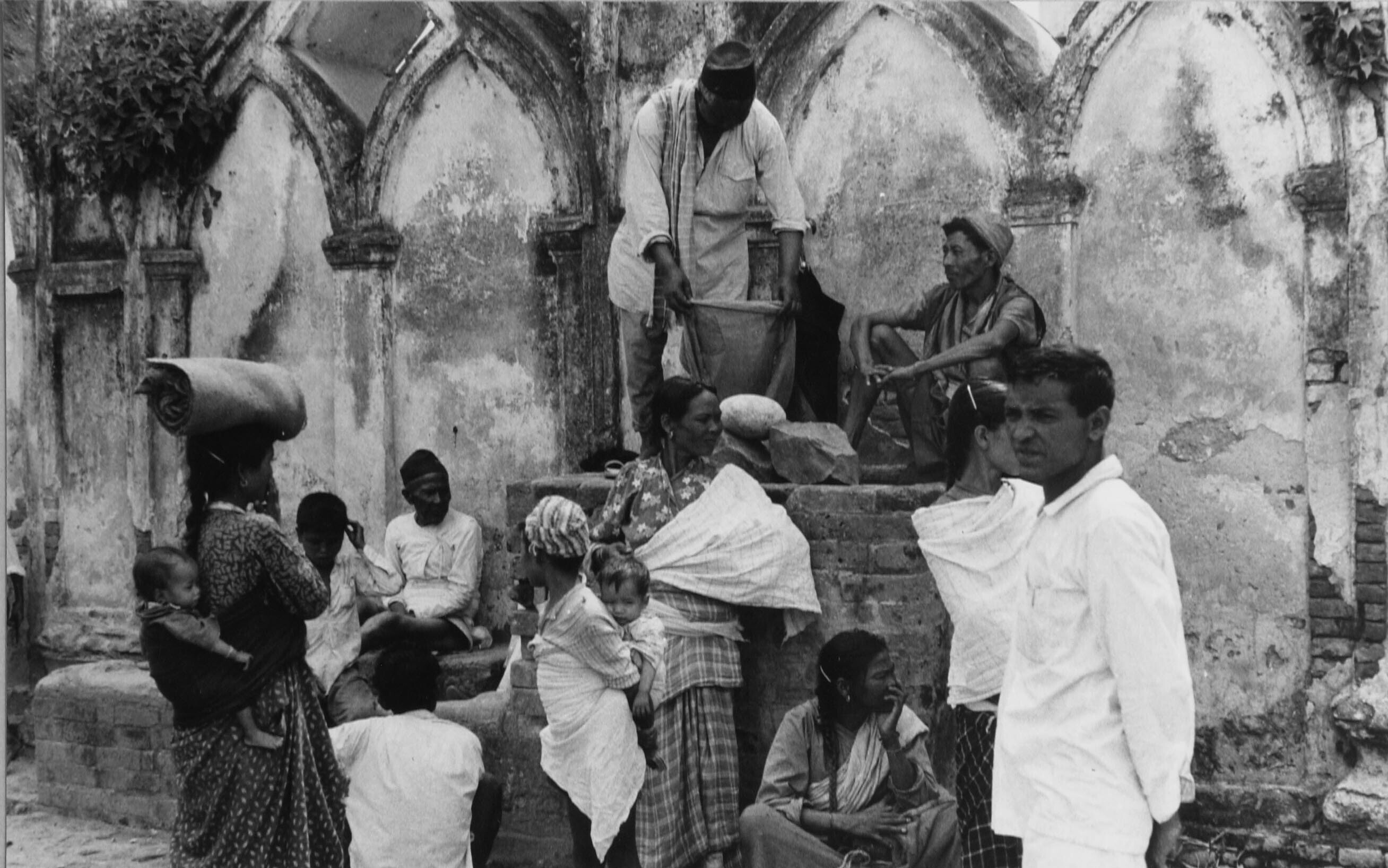 Groepje mensen bij de muur rond de Bhimsen Toren