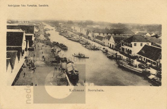 Zicht op kades aan de rivier Kalimaas, Surabaya, Ind...