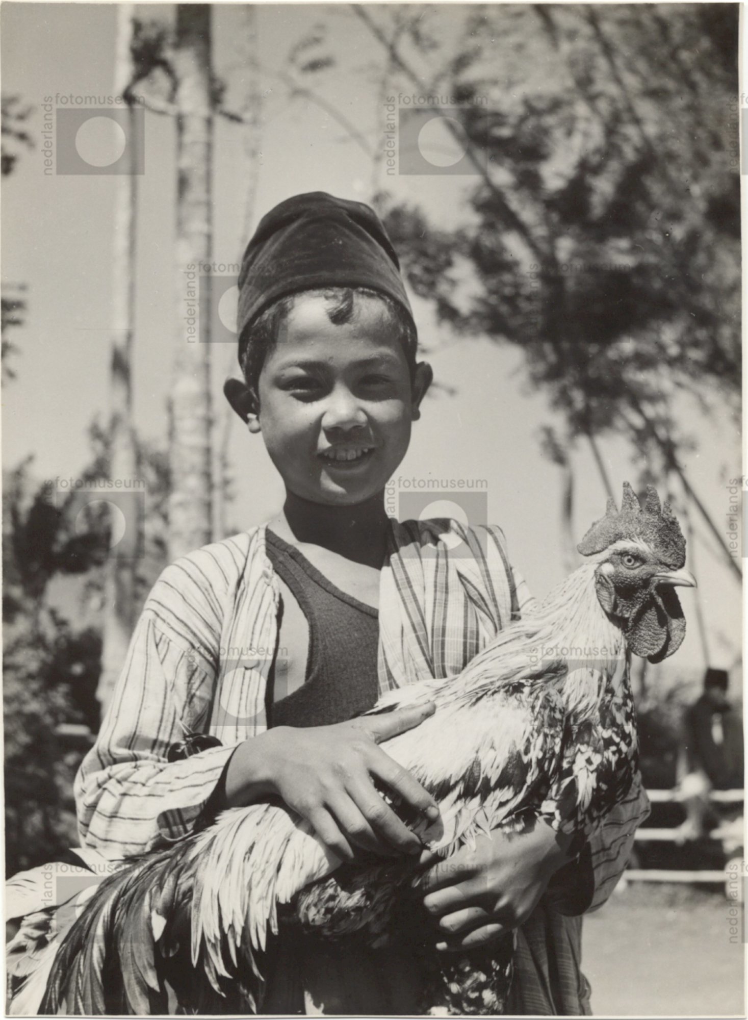 Jongen met vechthaan op zijn arm, Garut, Java. Indon...