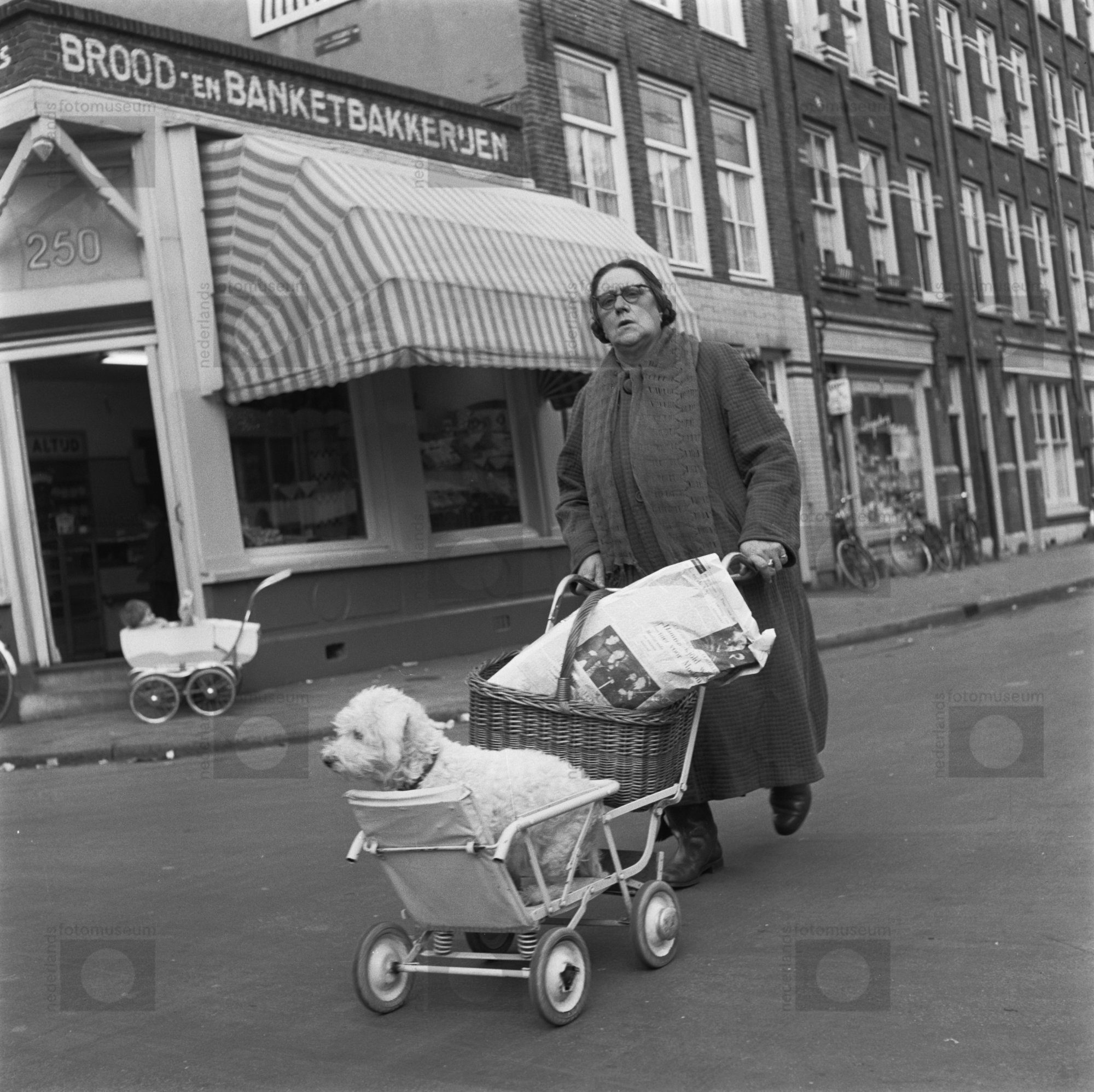 Amsterdam. Vrouw loopt met een hond in kinderwagen