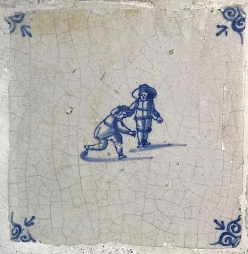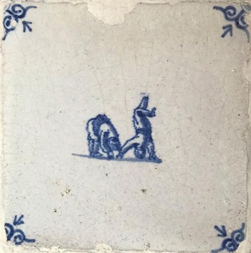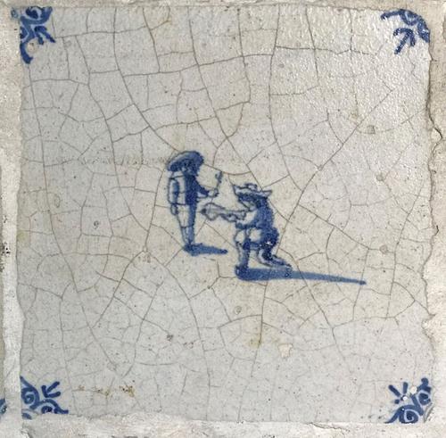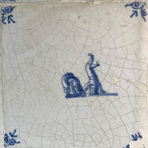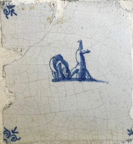 Tegel van aardewerk met tinglazuur voorstellende klo...