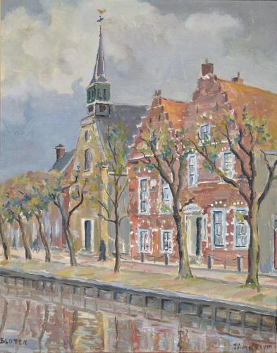 Olieverf schilderij van Grote Kerk Sloten in lijst, ...