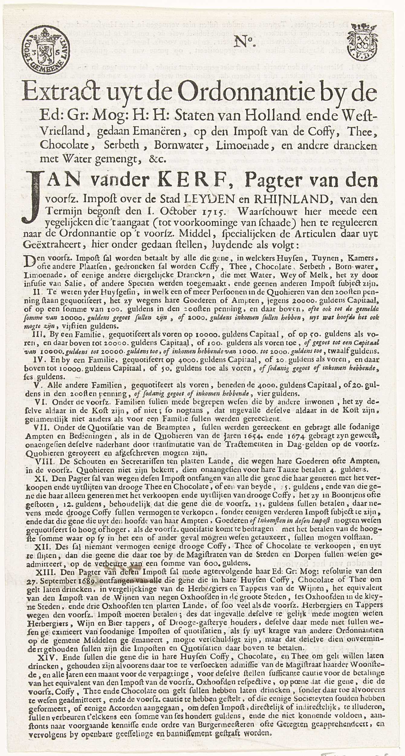 Impost op de dranken koffie, thee, chocolade etc, 1717