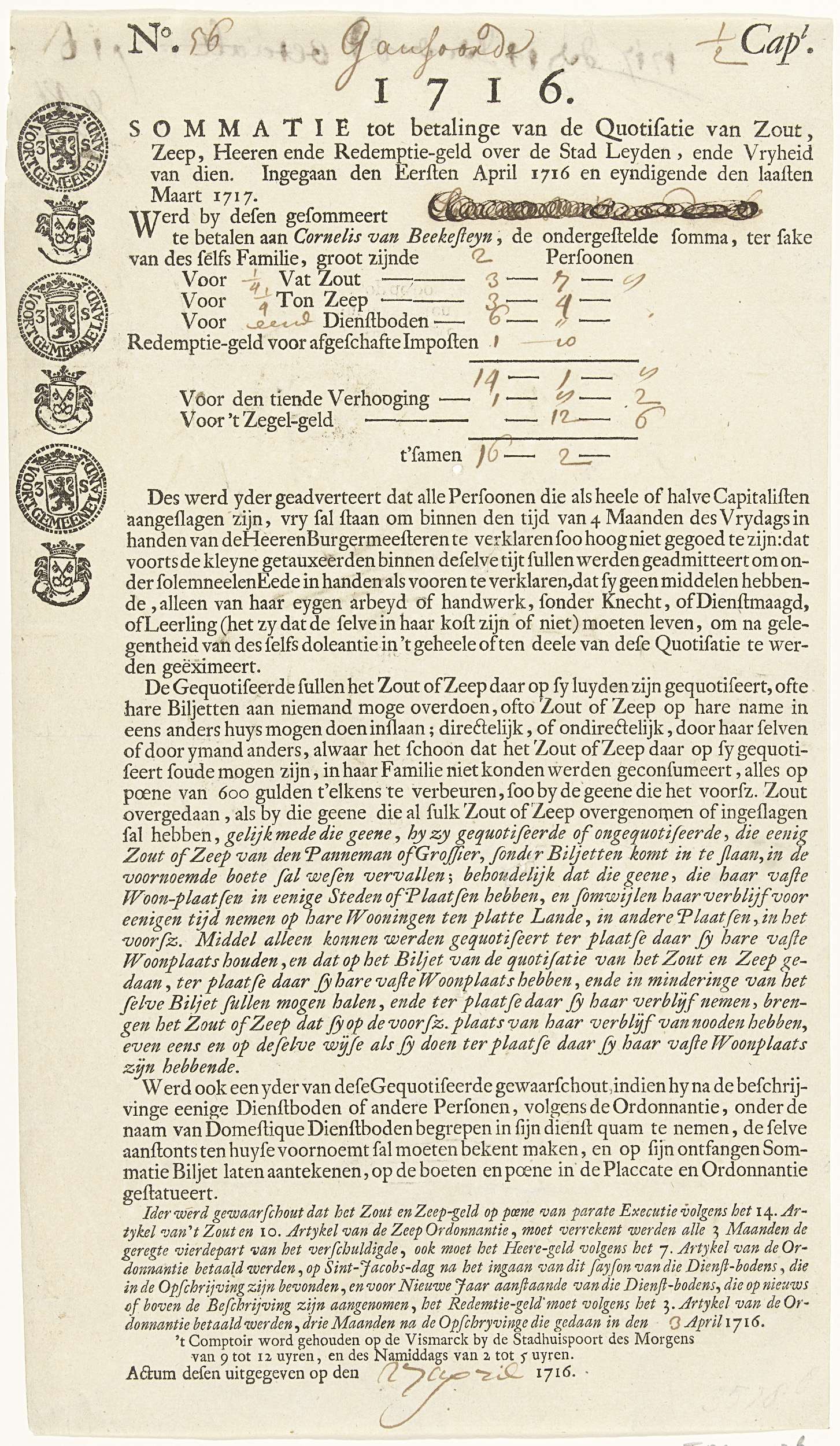 Sommatie tot het betalen voor zout, zeep, etc. aan d...