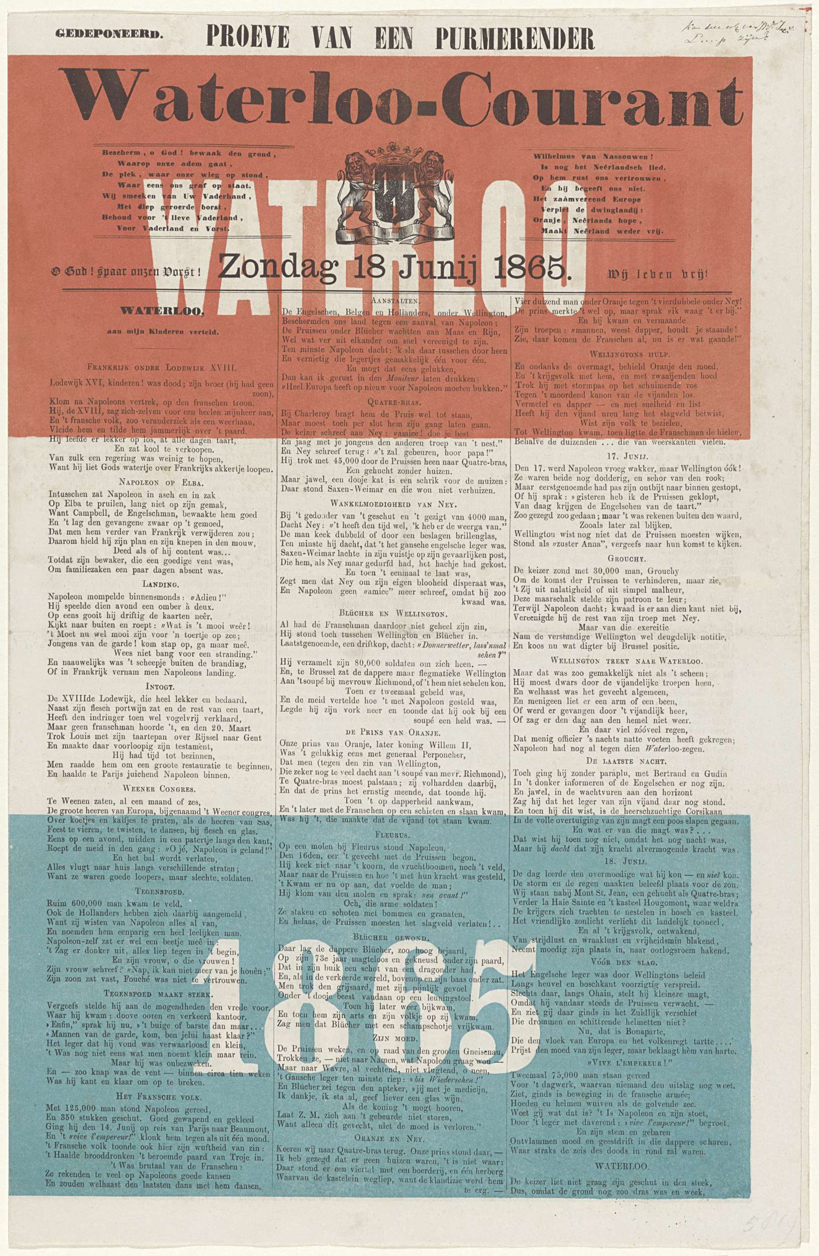 Proeve van een Purmerender. Waterloo-Courant. Zondag...