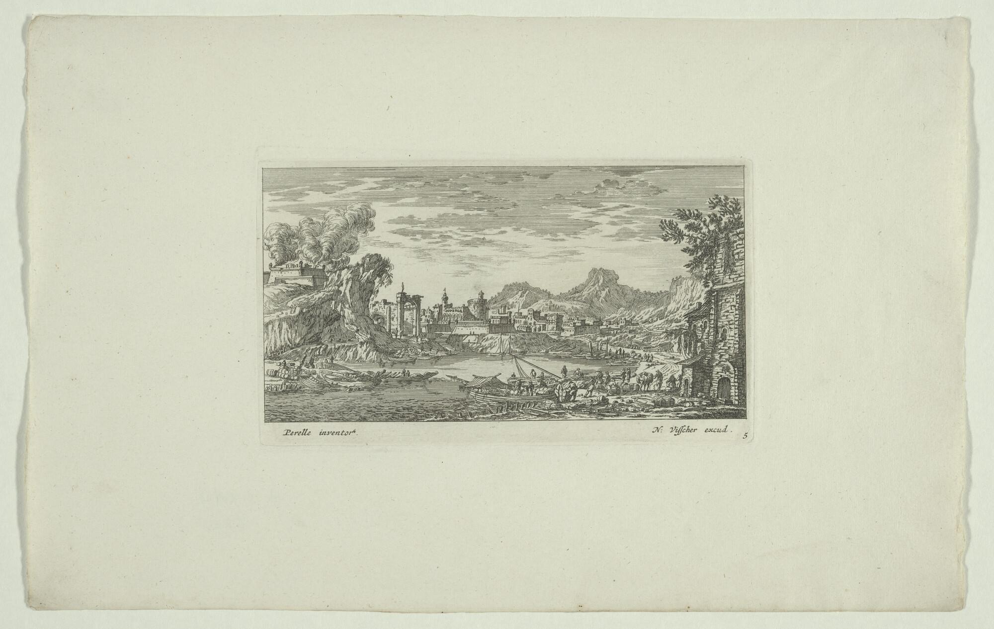 Gezicht op een haven in een landschap