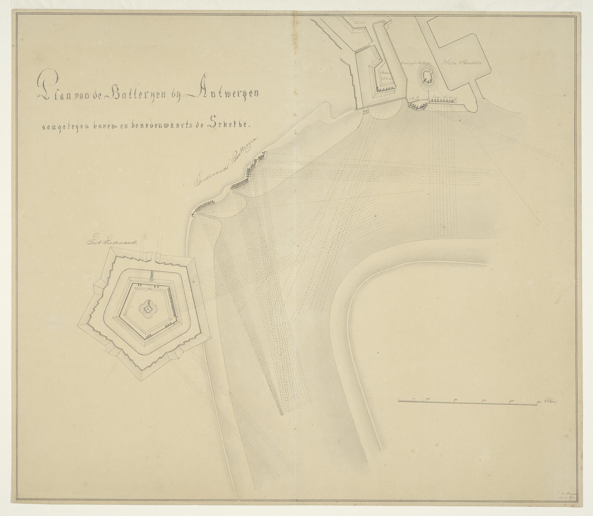 Manuscriptkaart van de ligging der batterijen bij An...