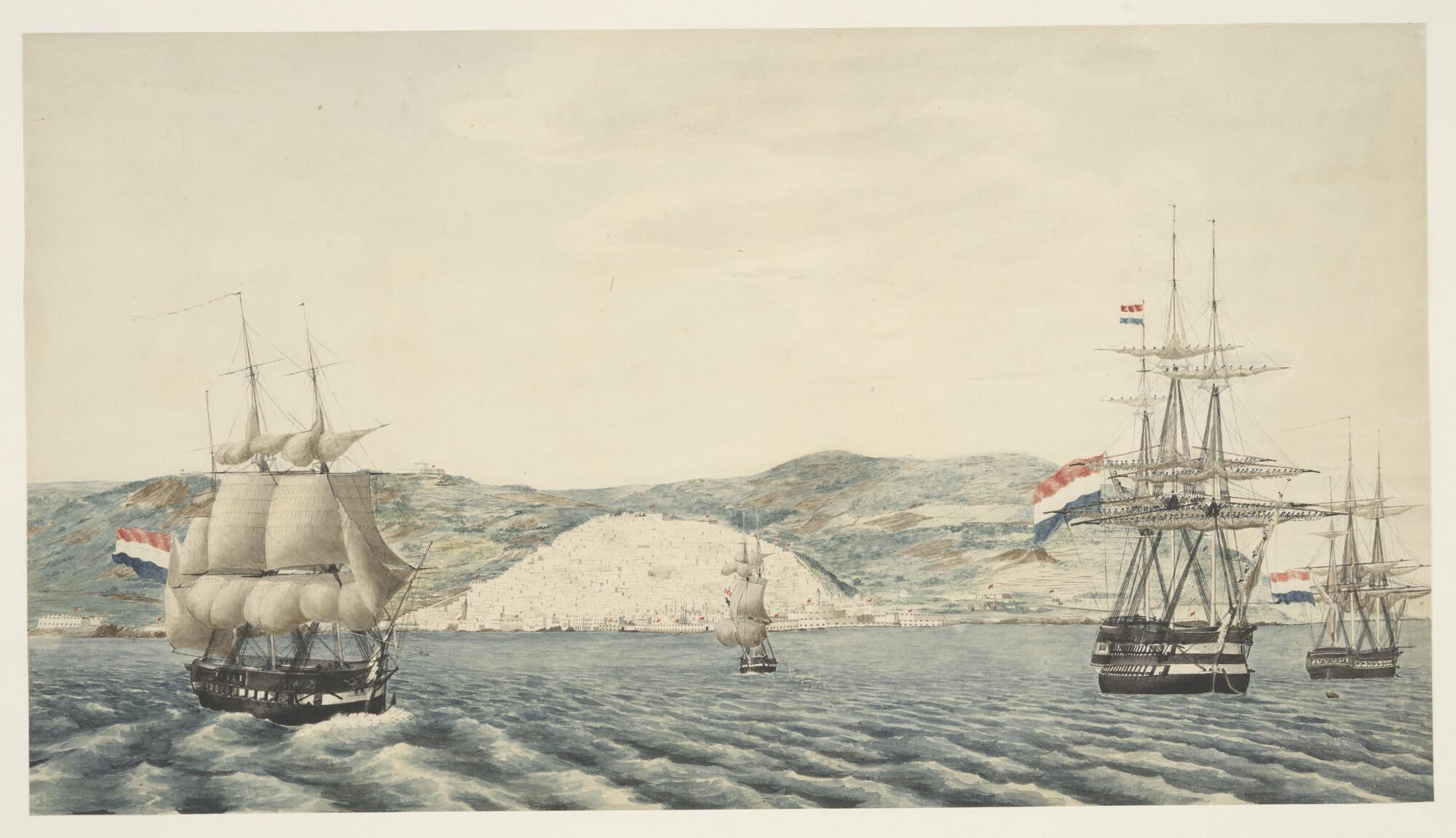 Nederlandse oorlogsschepen op de rede van het eiland...