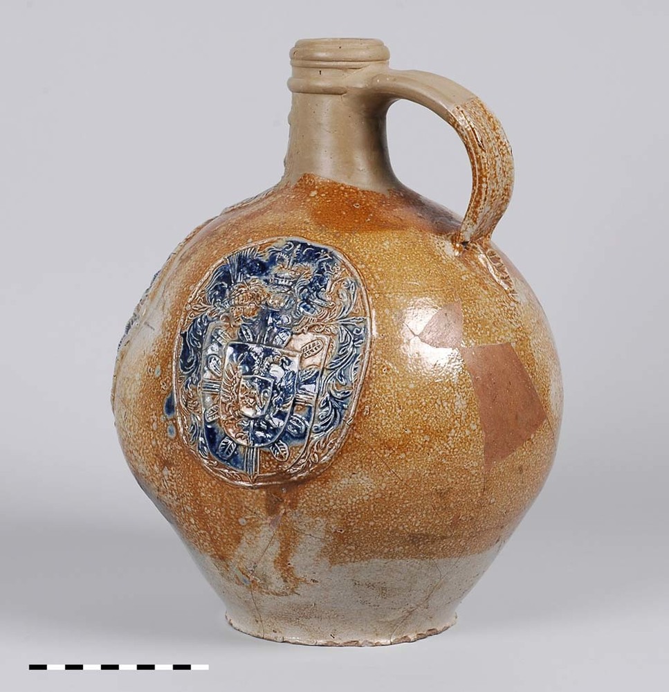 Baardmankruik van steengoed aardewerk uit 1606 met h...