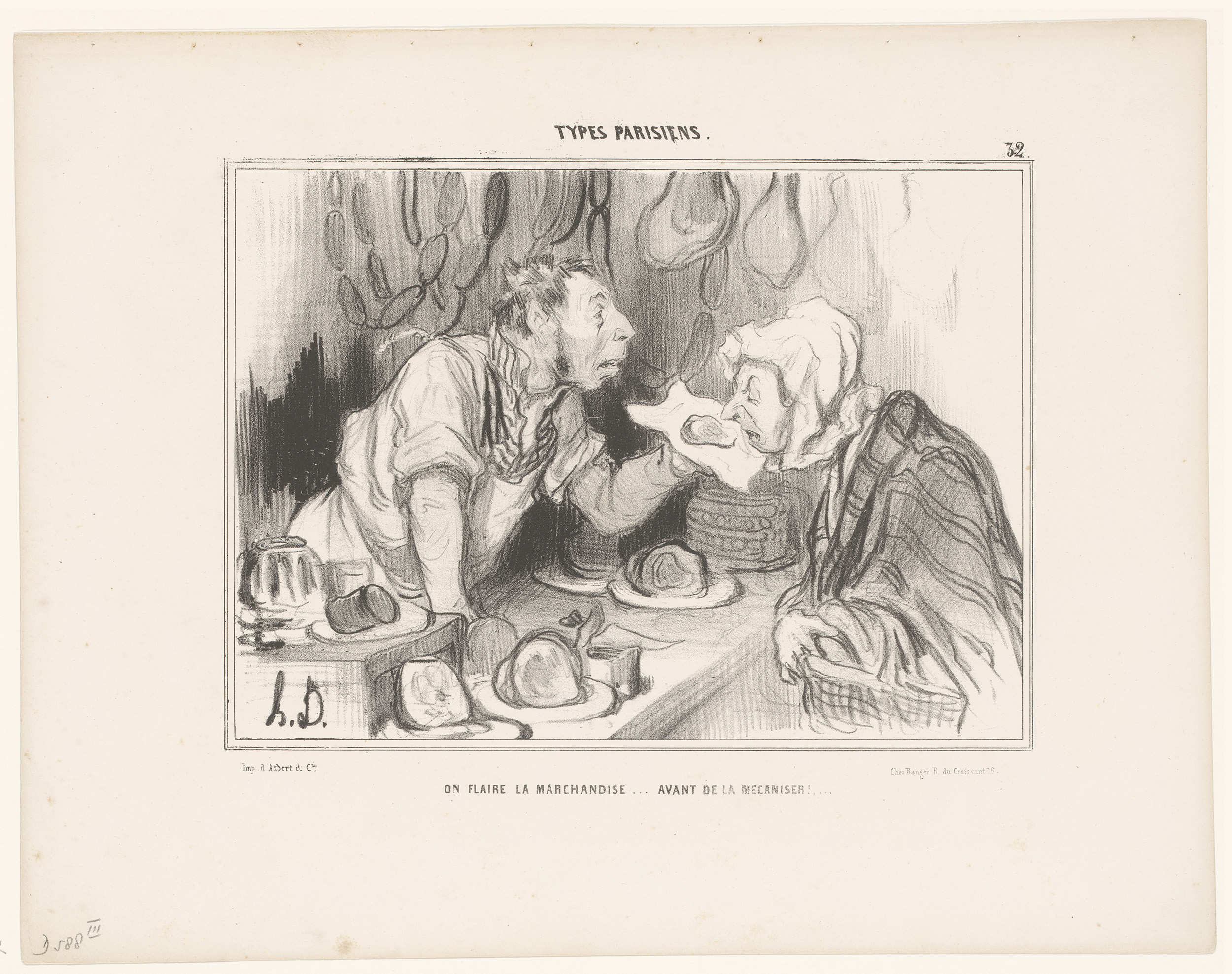 Oude vrouw ruikt aan een stuk vlees van de slager