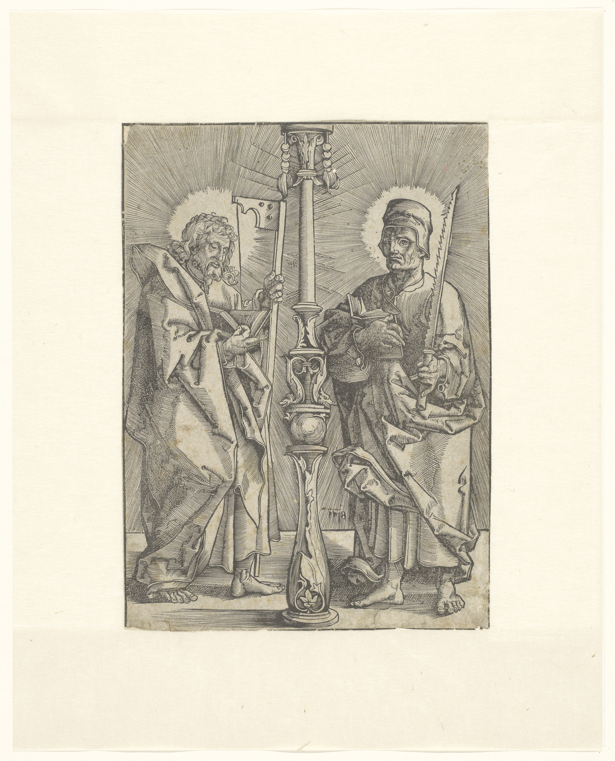 Aan een zuil gebonden man, man te paard en geboeide ...