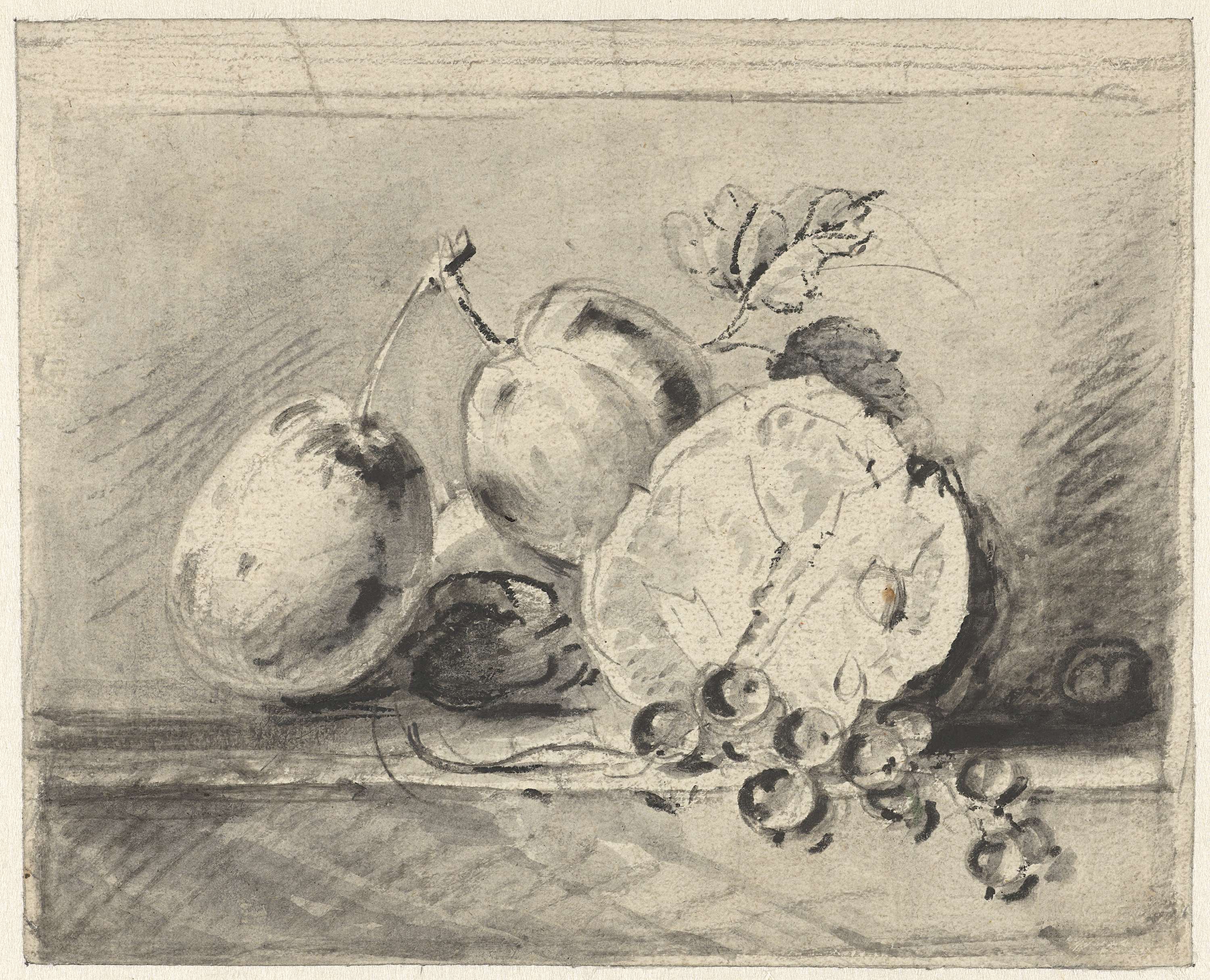 Straat met figuren op een trap en vrouwen met schale...