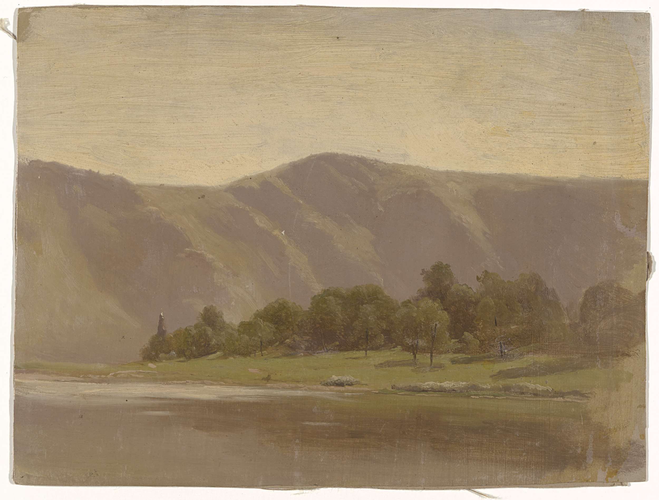 Heuvellandschap met figuren bij de oever van een rivier