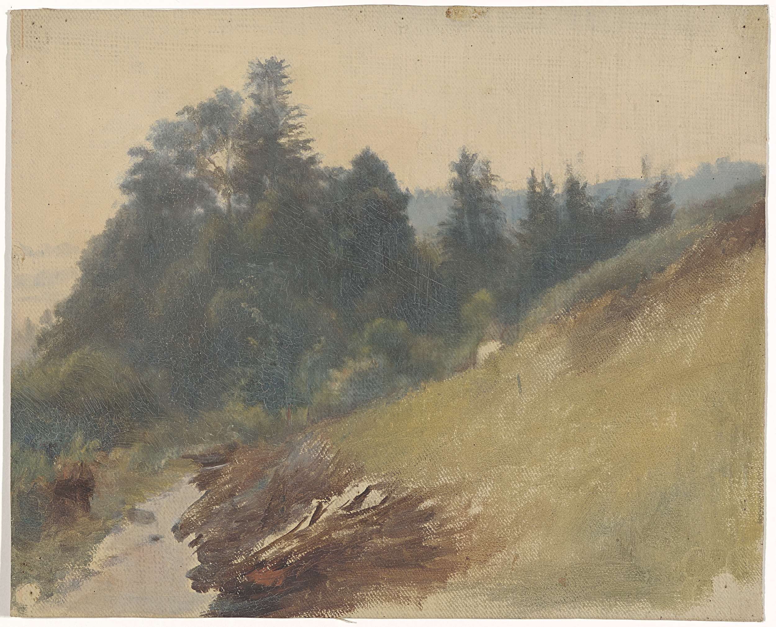 Heuvellandschap met figuren op een landweg