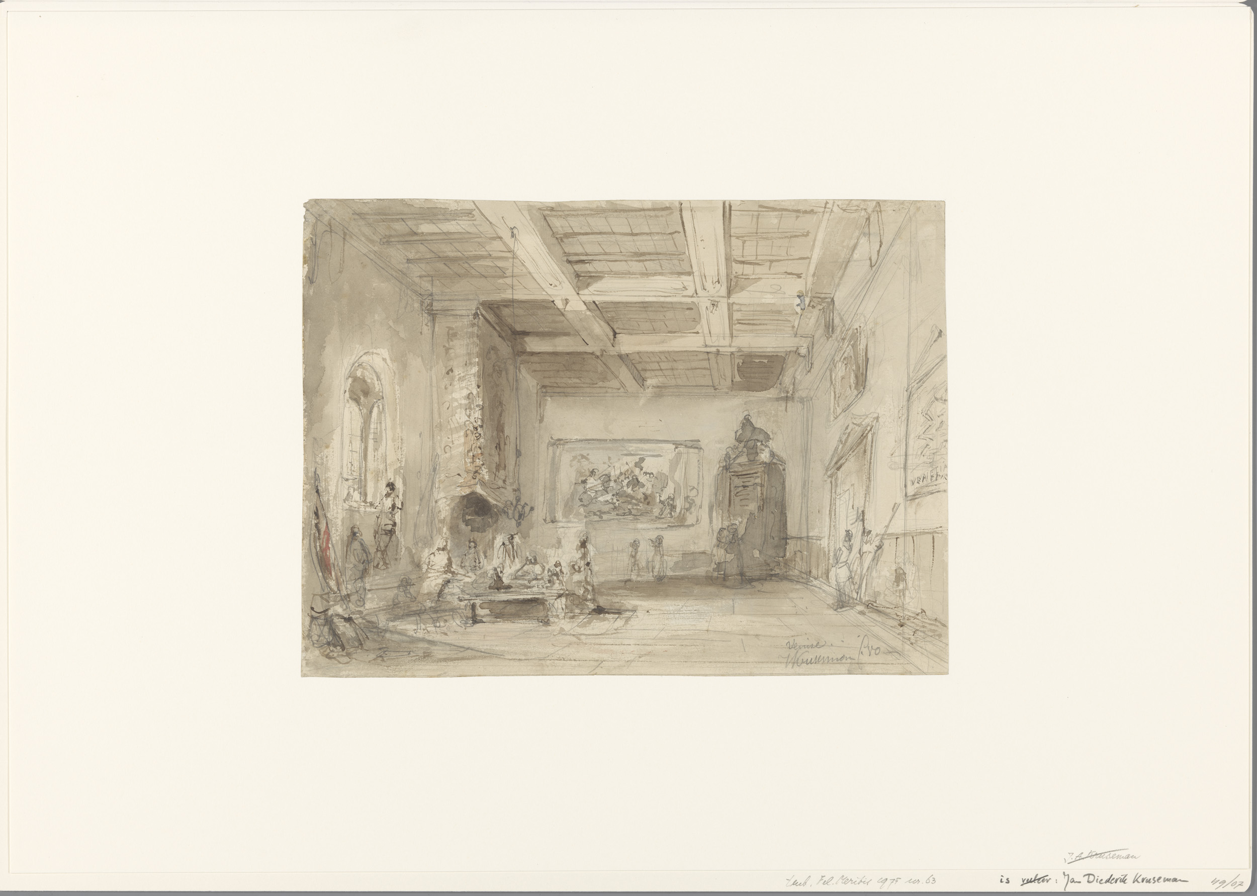 Interieur van grote zaal met schilderijen, een kaart...