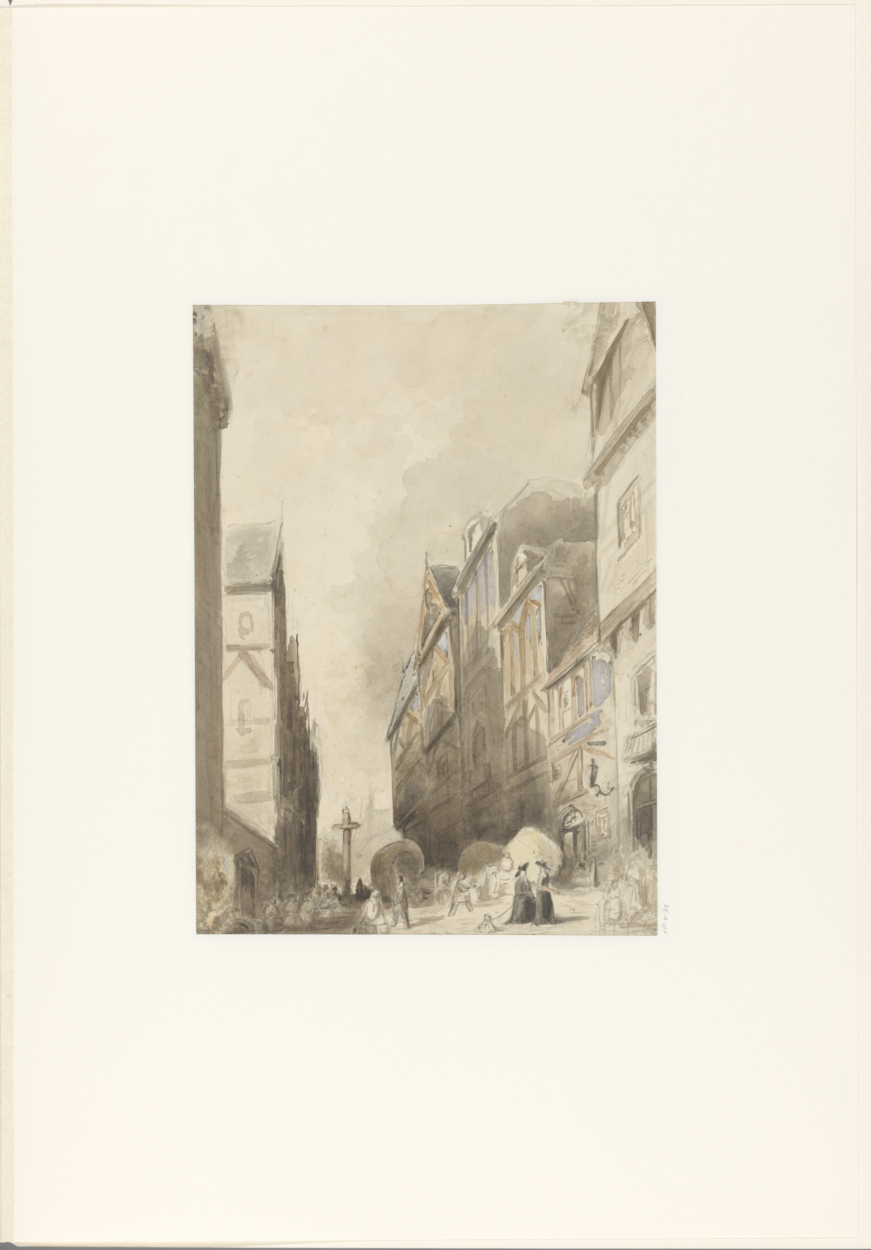 Straat met figuren en huizen met luifels