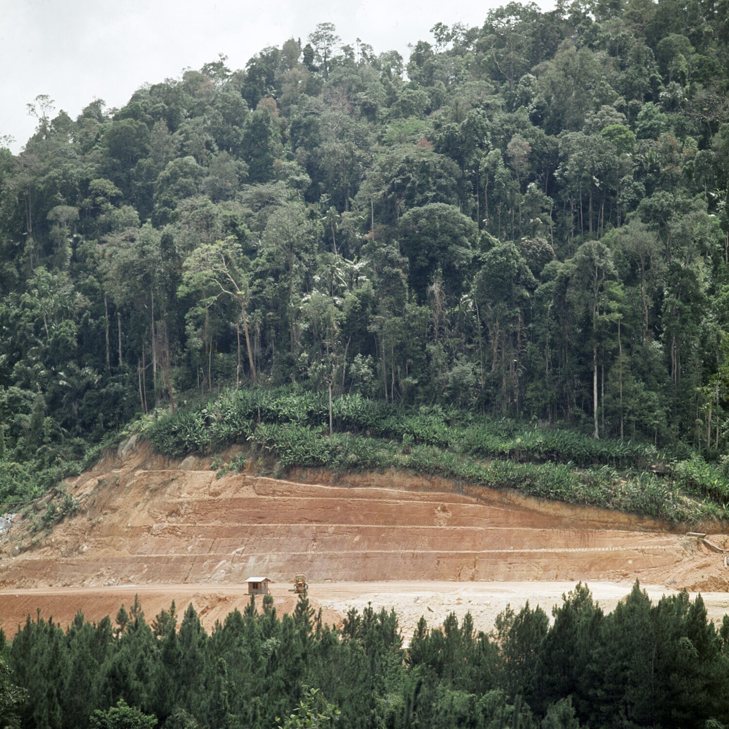 Het wegkappen van het regenwoud t.b.v. een weg (Kual...