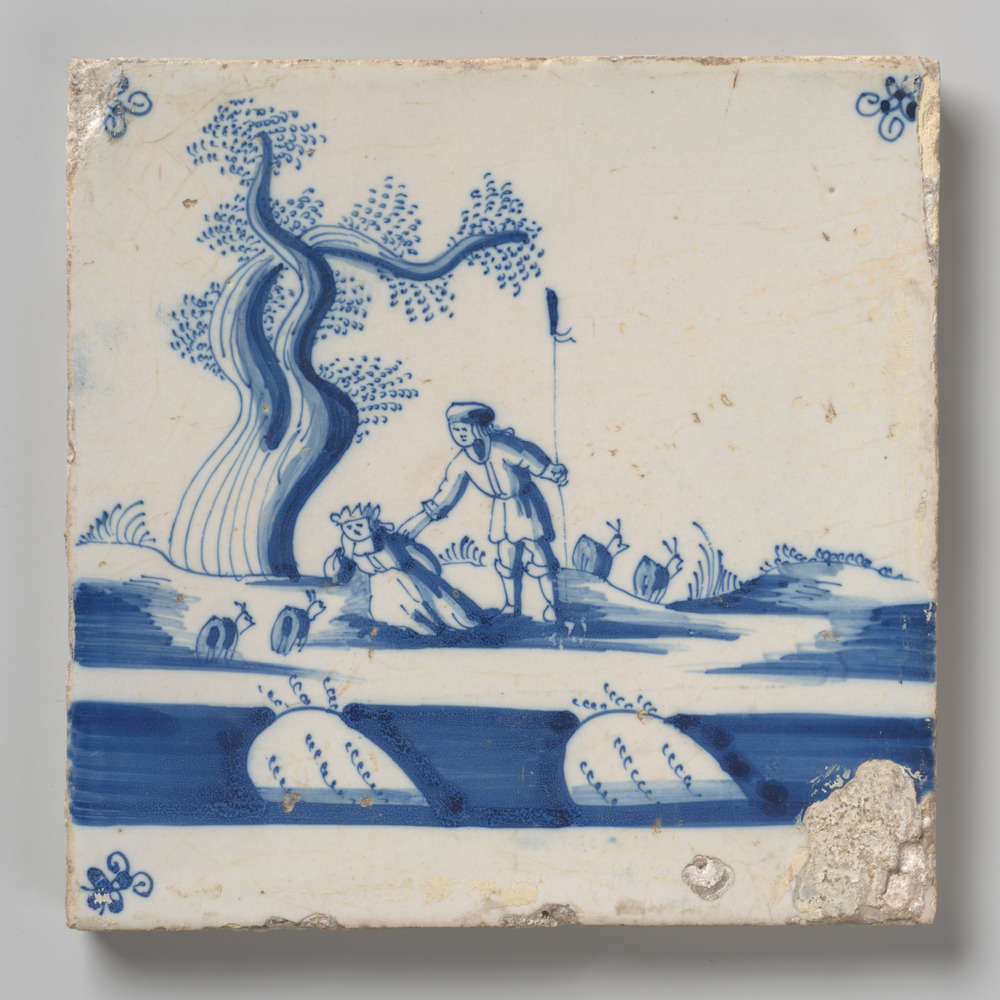 tegel van aardewerk met tinglazuur, voorstellende: k...