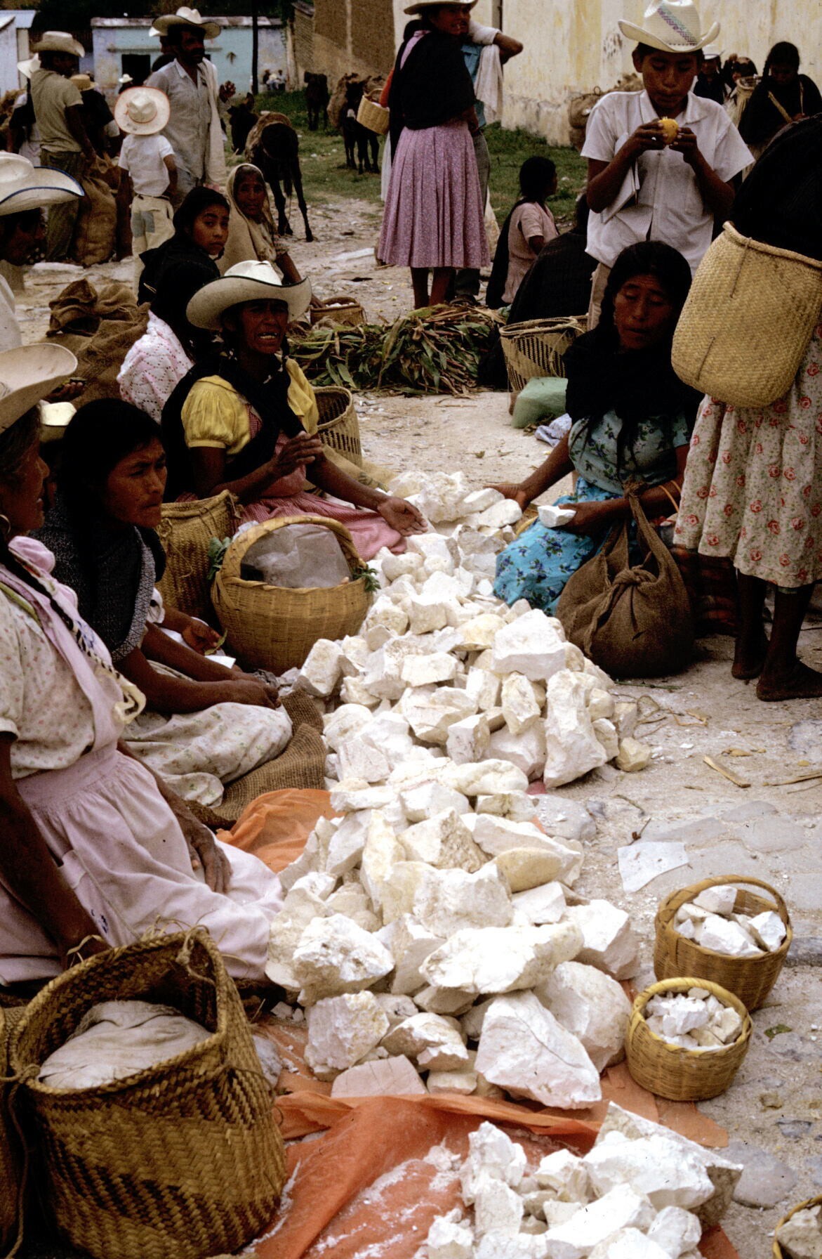 marktscène met kalkblokkenverkoop (voor maïsbereiding)