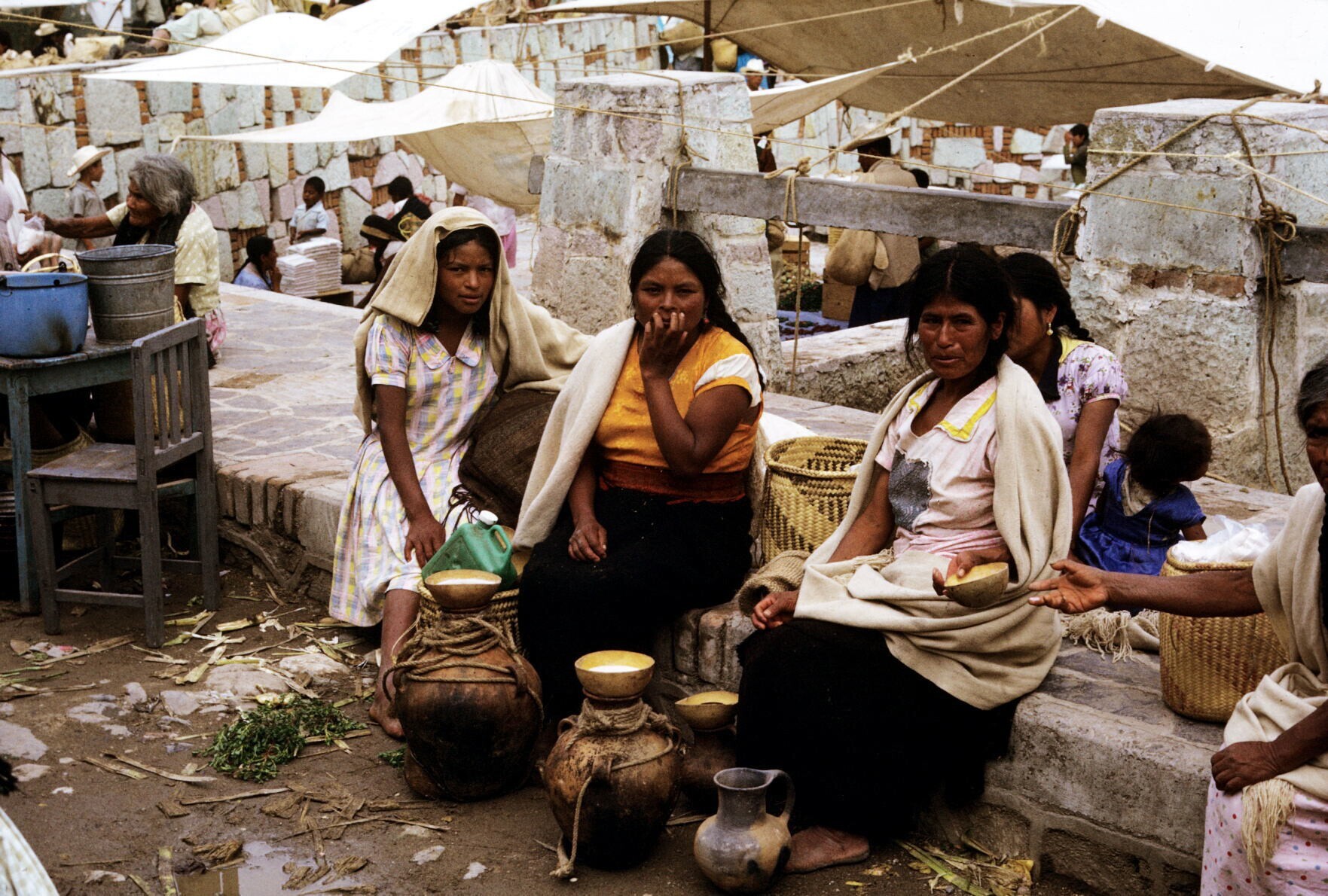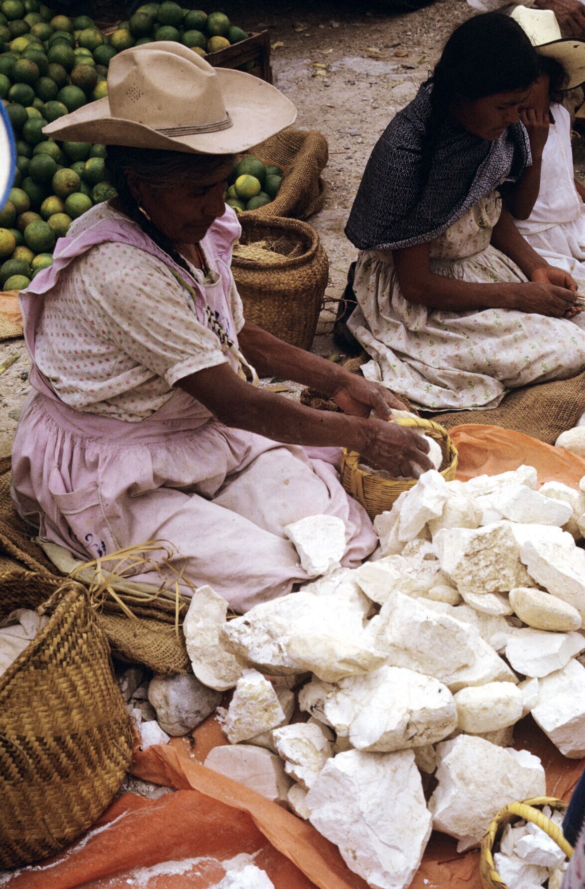marktvrouwen, kalkblokken verkopend (voor maïsbereid...