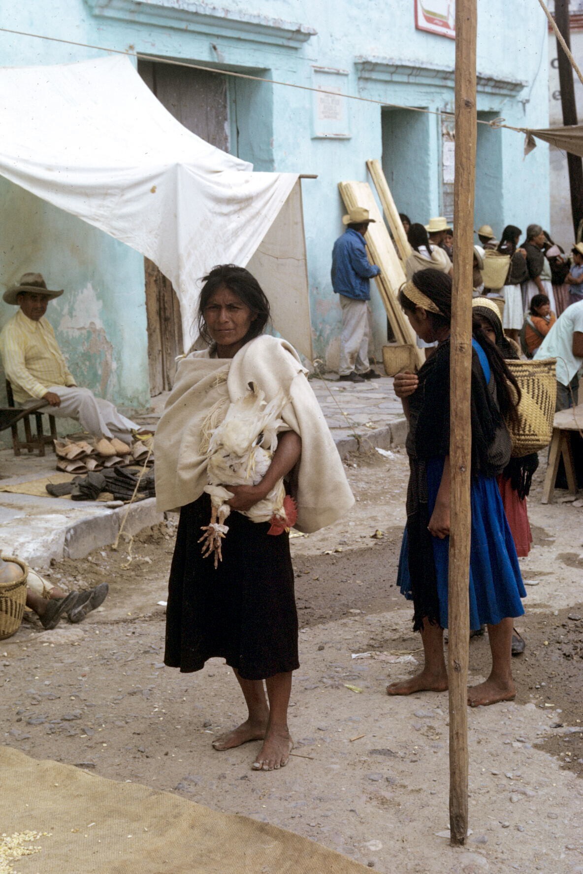 vrouw op markt, haan dragend; op achtergornd: sandal...