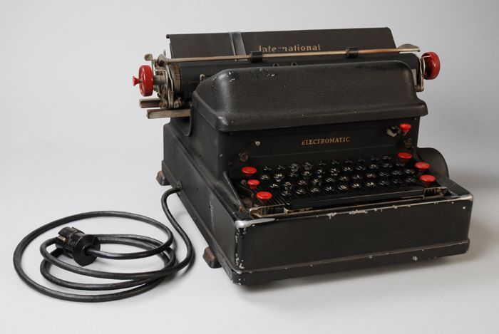 Zwarte IBM elektrische kantoortypmachine, met opschr...
