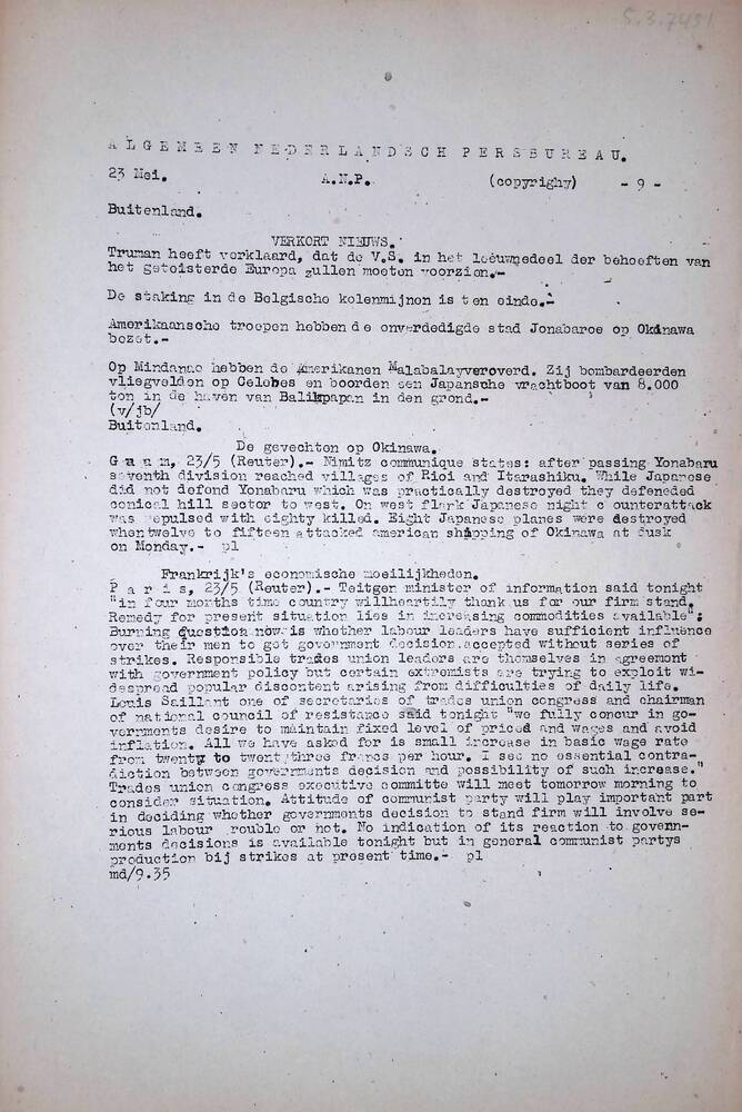 Algemeen Nederlandsch Persbureau, mededelingen, 23 m...