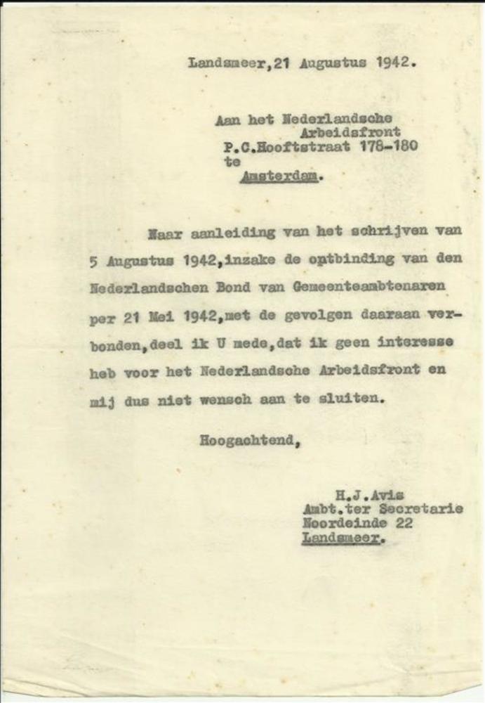 Aan het Nederlandsche Arbeidsfront Landsmeer 21 augu...