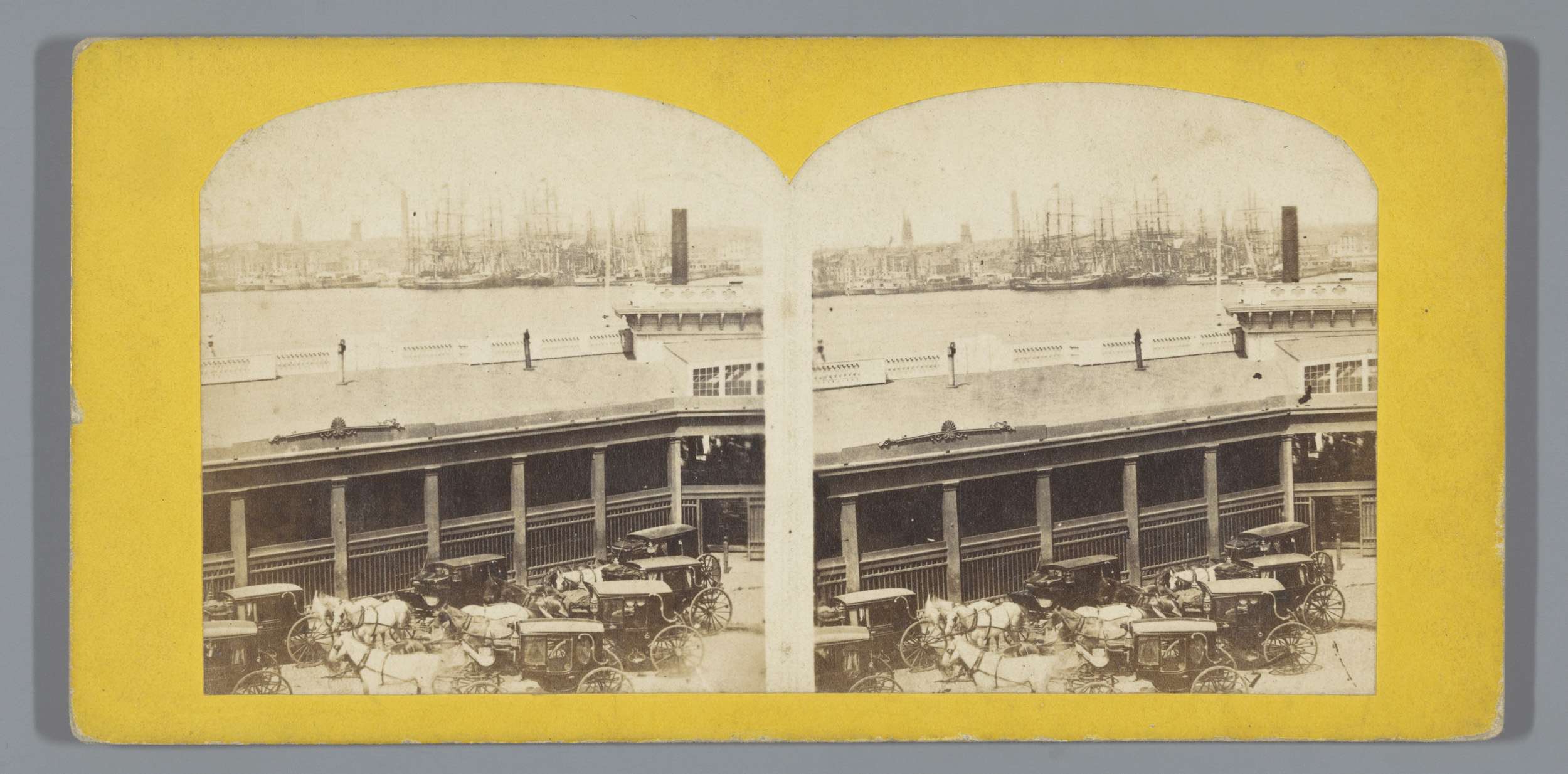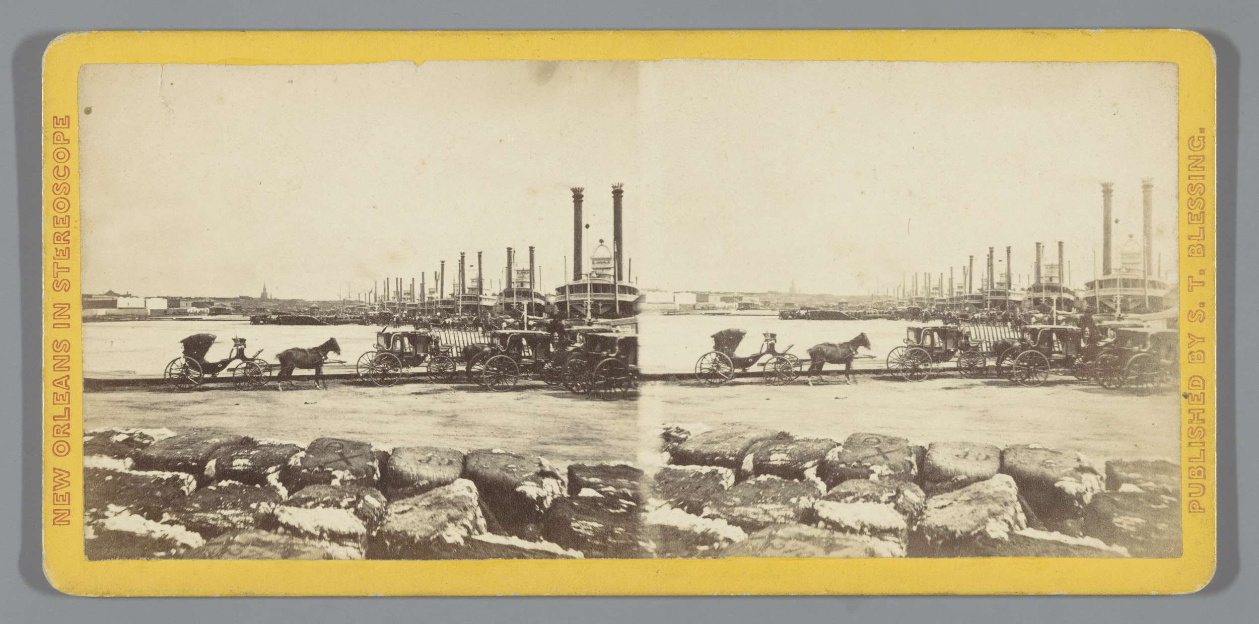 Koetsen en aangemeerde stoomschepen in New Orleans